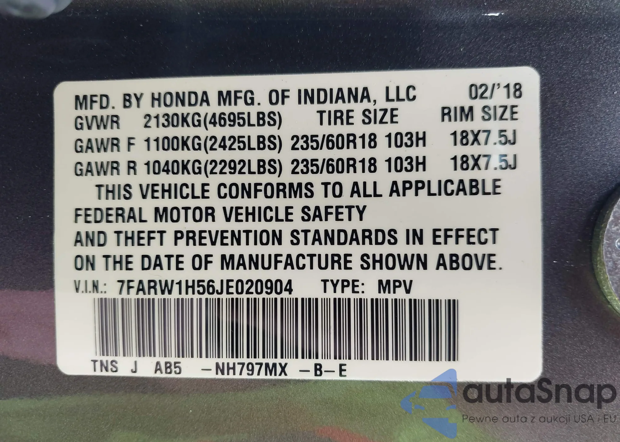 • VIN 7FARW1H56JE020904
