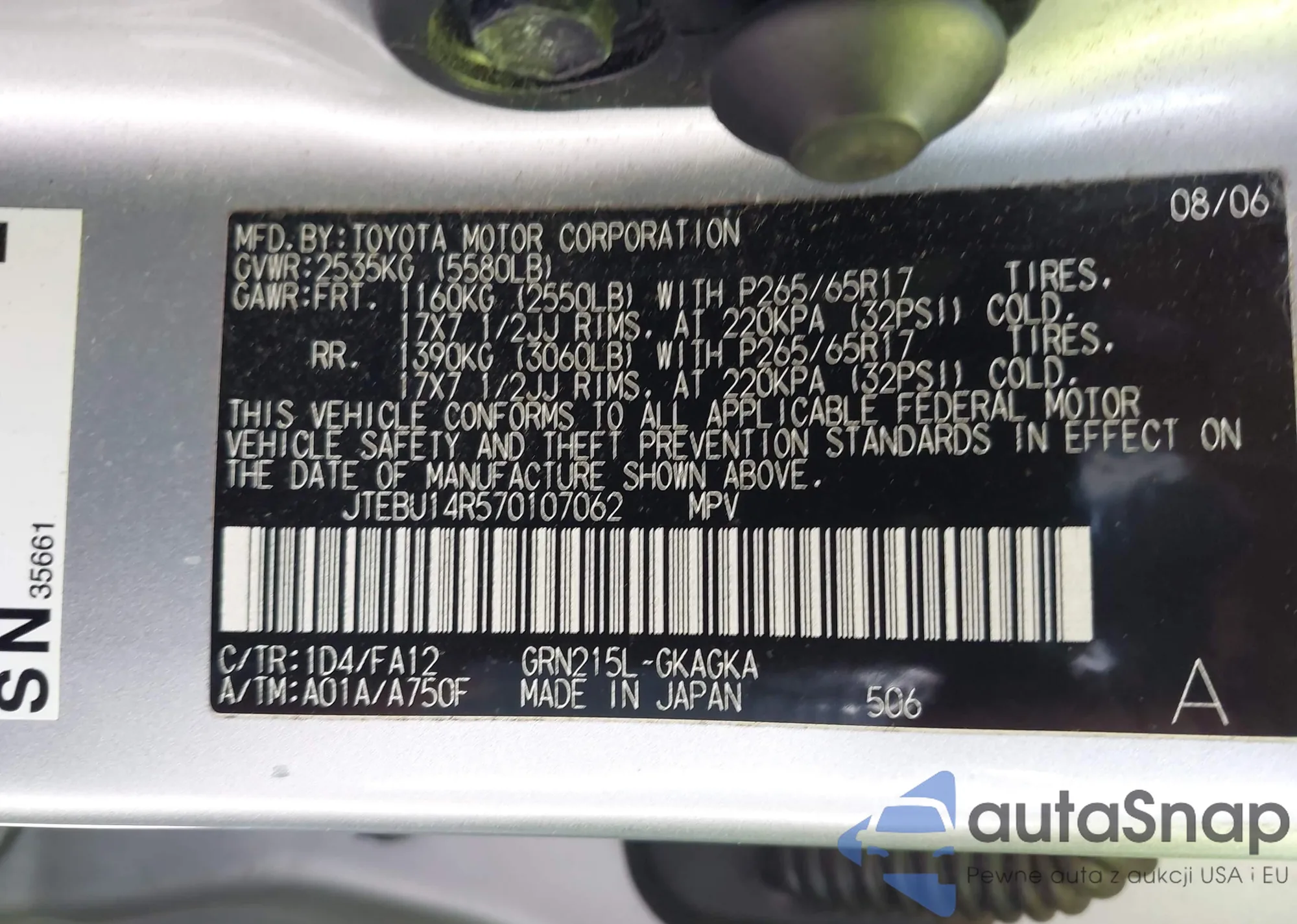 LOT: 42652414 VIN: JTEBU14R570107062