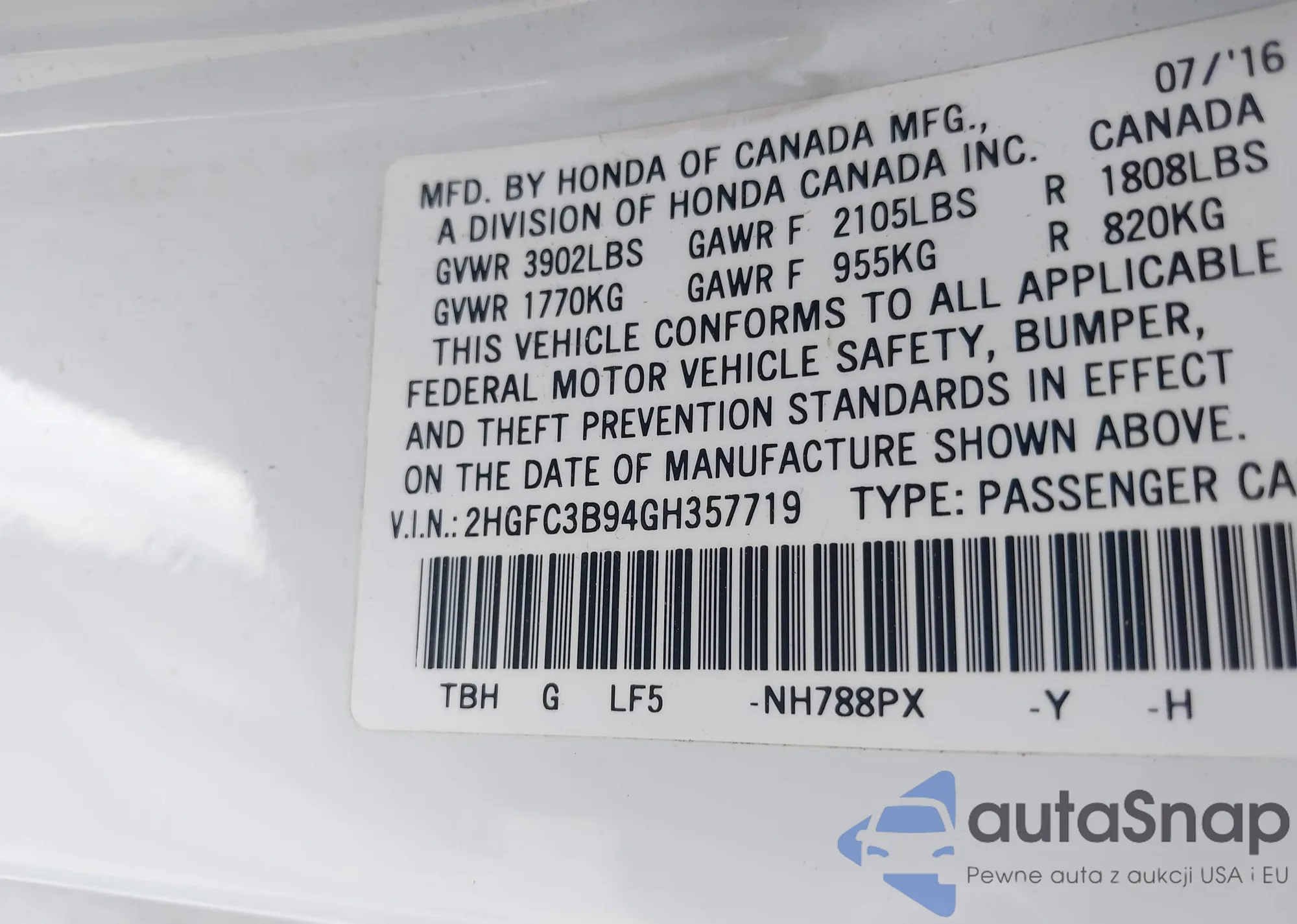 • VIN 2HGFC3B94GH357719