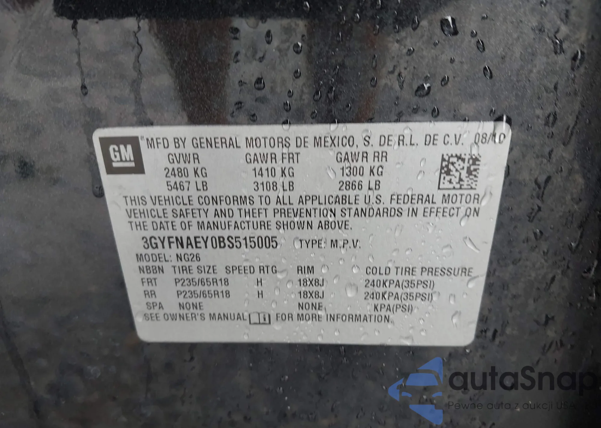 • VIN 3GYFNAEY0BS515005