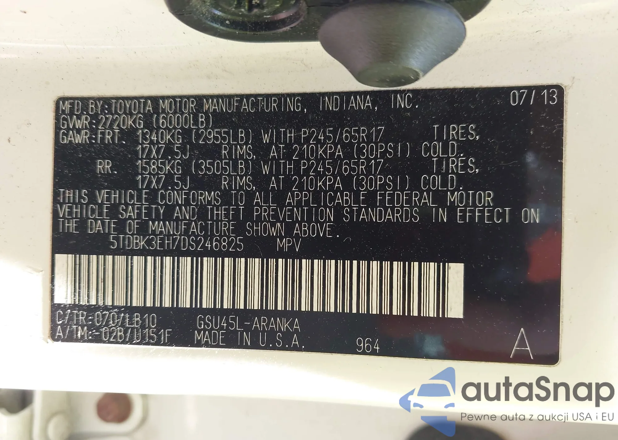 LOT: 42483191 VIN: 5TDBK3EH7DS246825