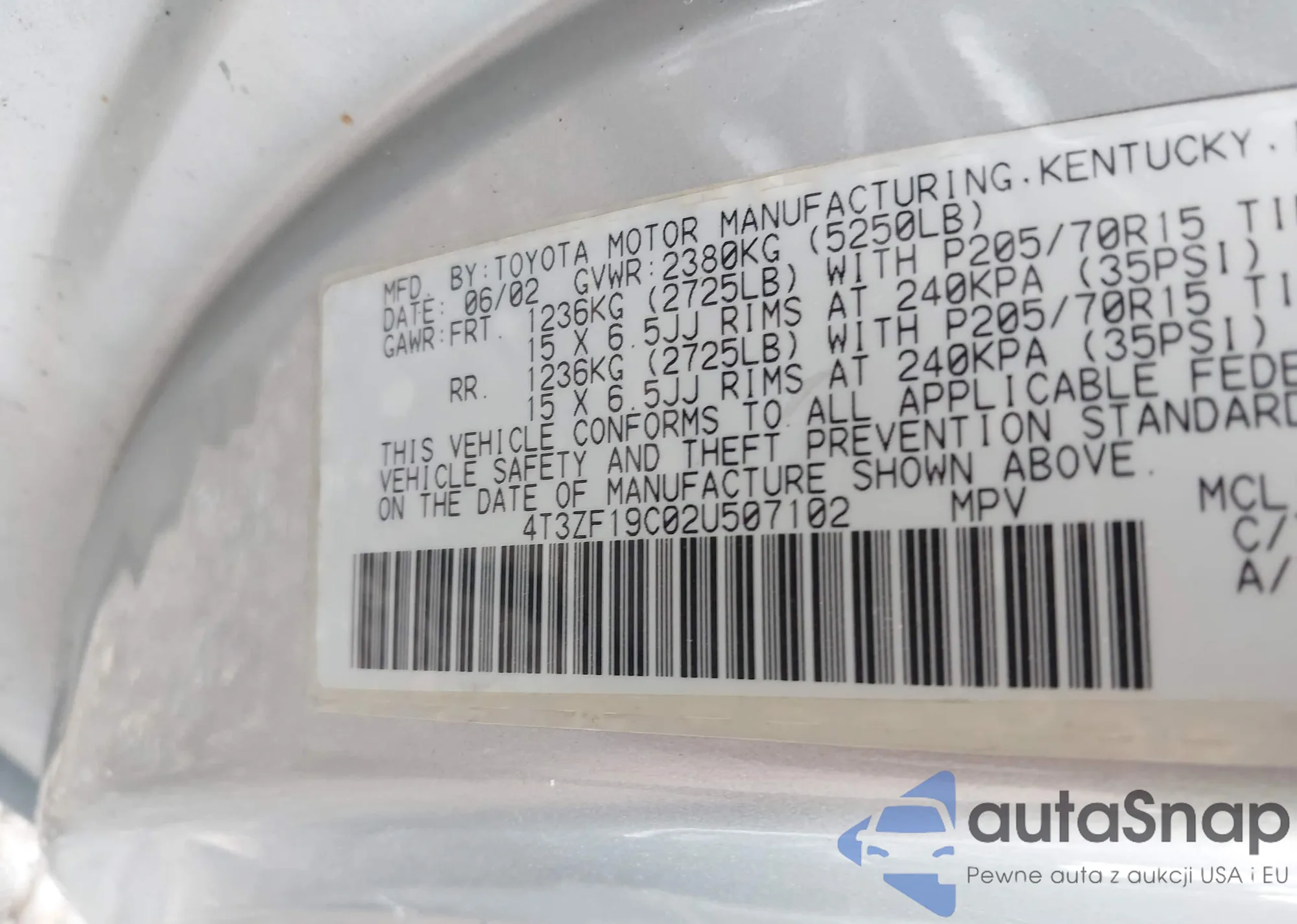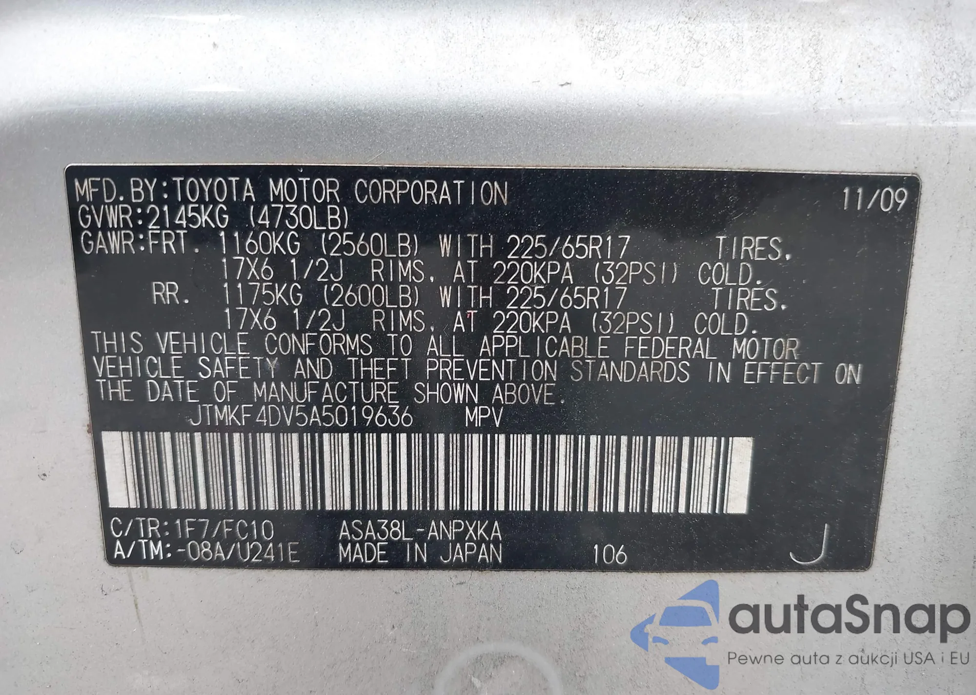LOT: 42903538 VIN: JTMKF4DV5A5019636