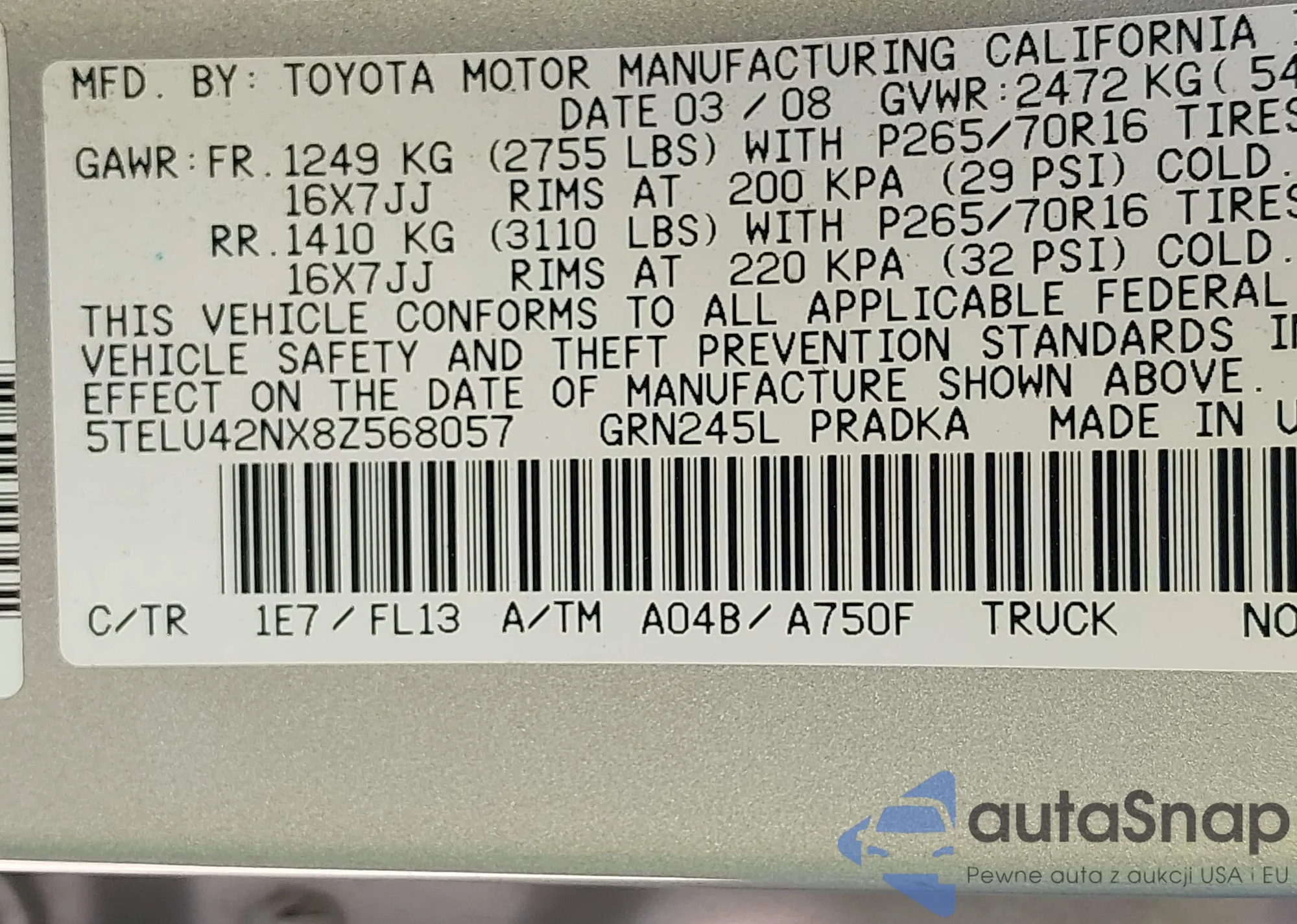 • VIN 5TELU42NX8Z568057