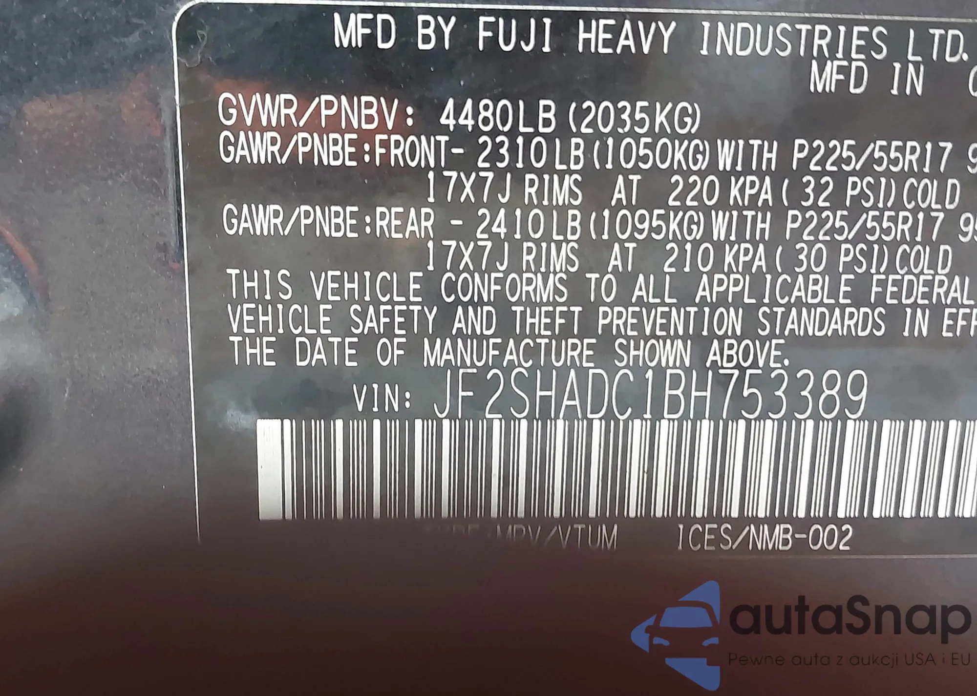 LOT: 42296863 VIN: JF2SHADC1BH753389