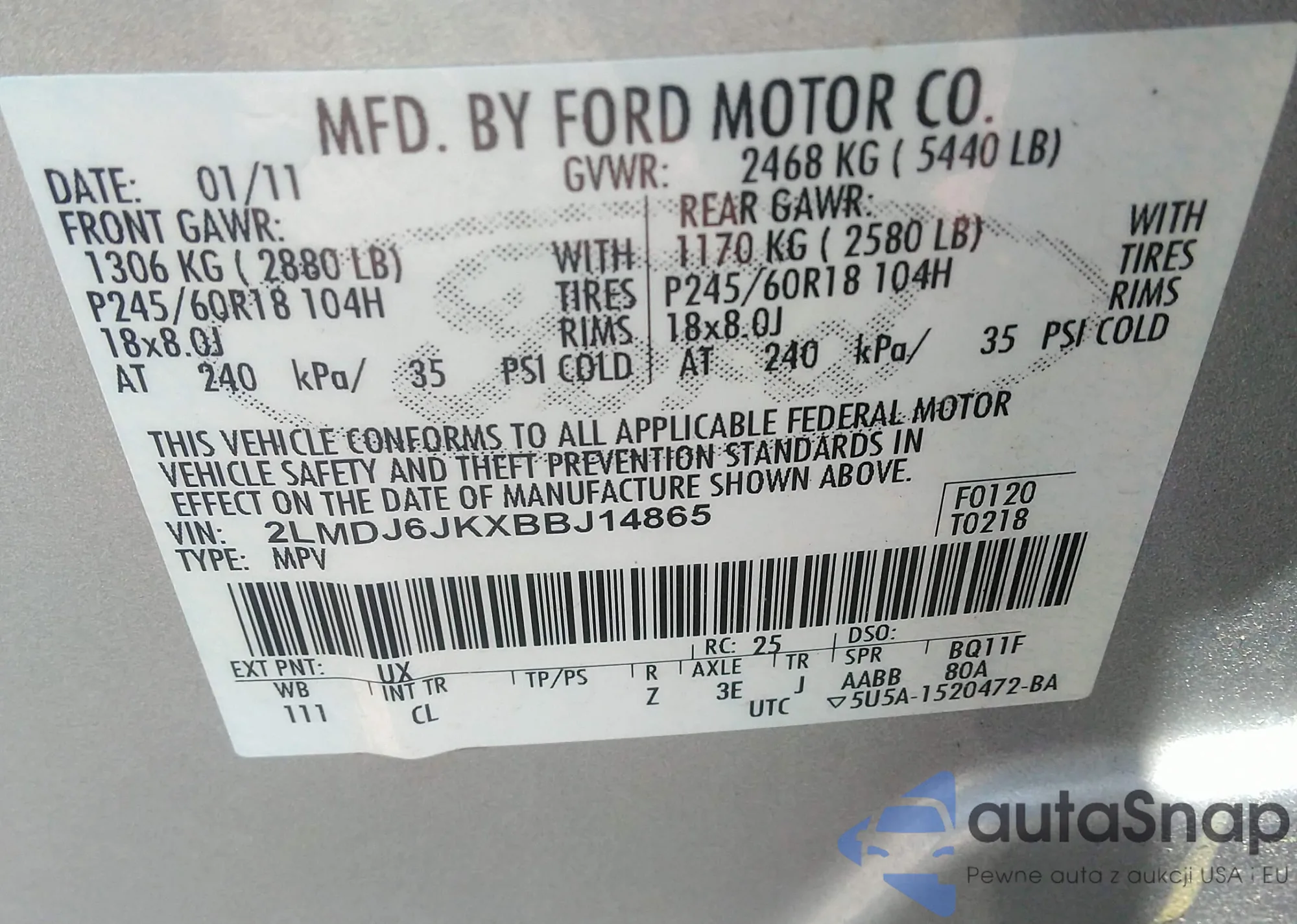 LOT: 42536444 VIN: 2LMDJ6JKXBBJ14865