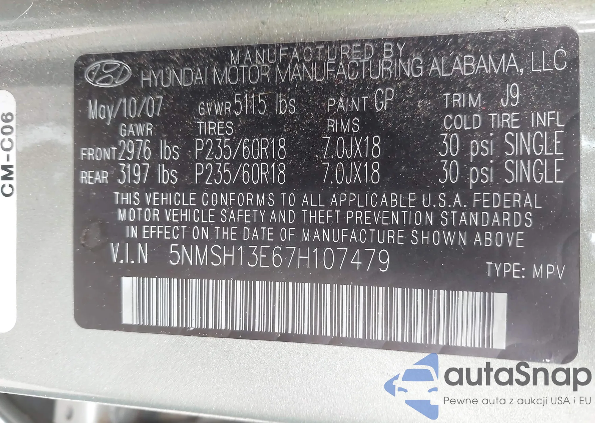 • VIN 5NMSH13E67H107479