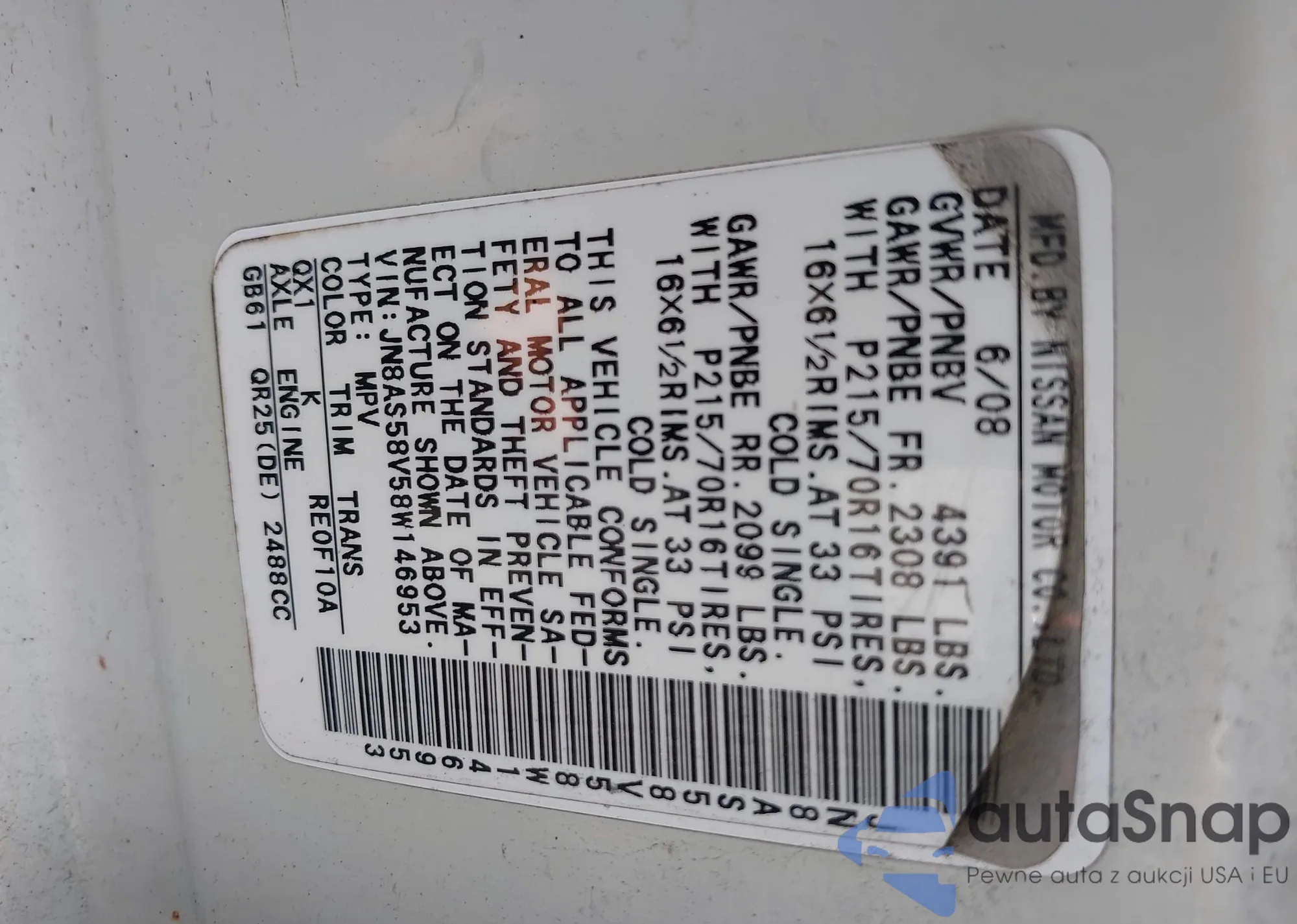 • VIN JN8AS58V58W146953
