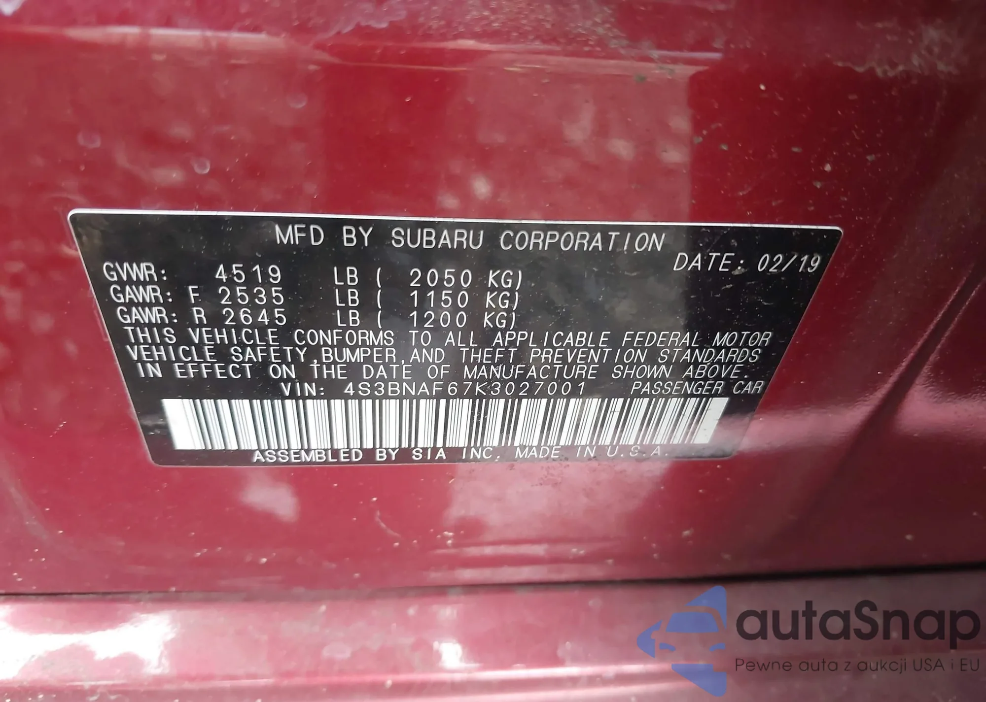 LOT: 42584597 VIN: 4S3BNAF67K3027001