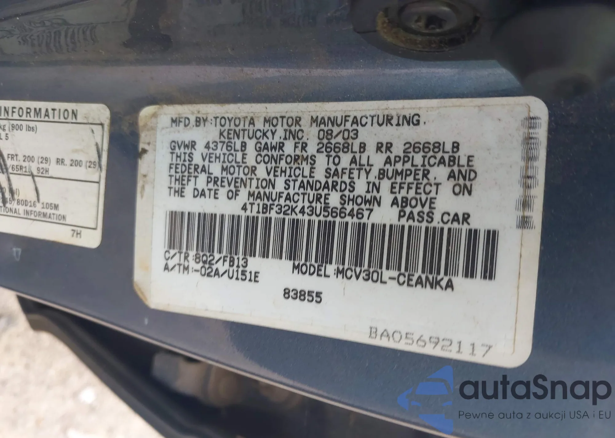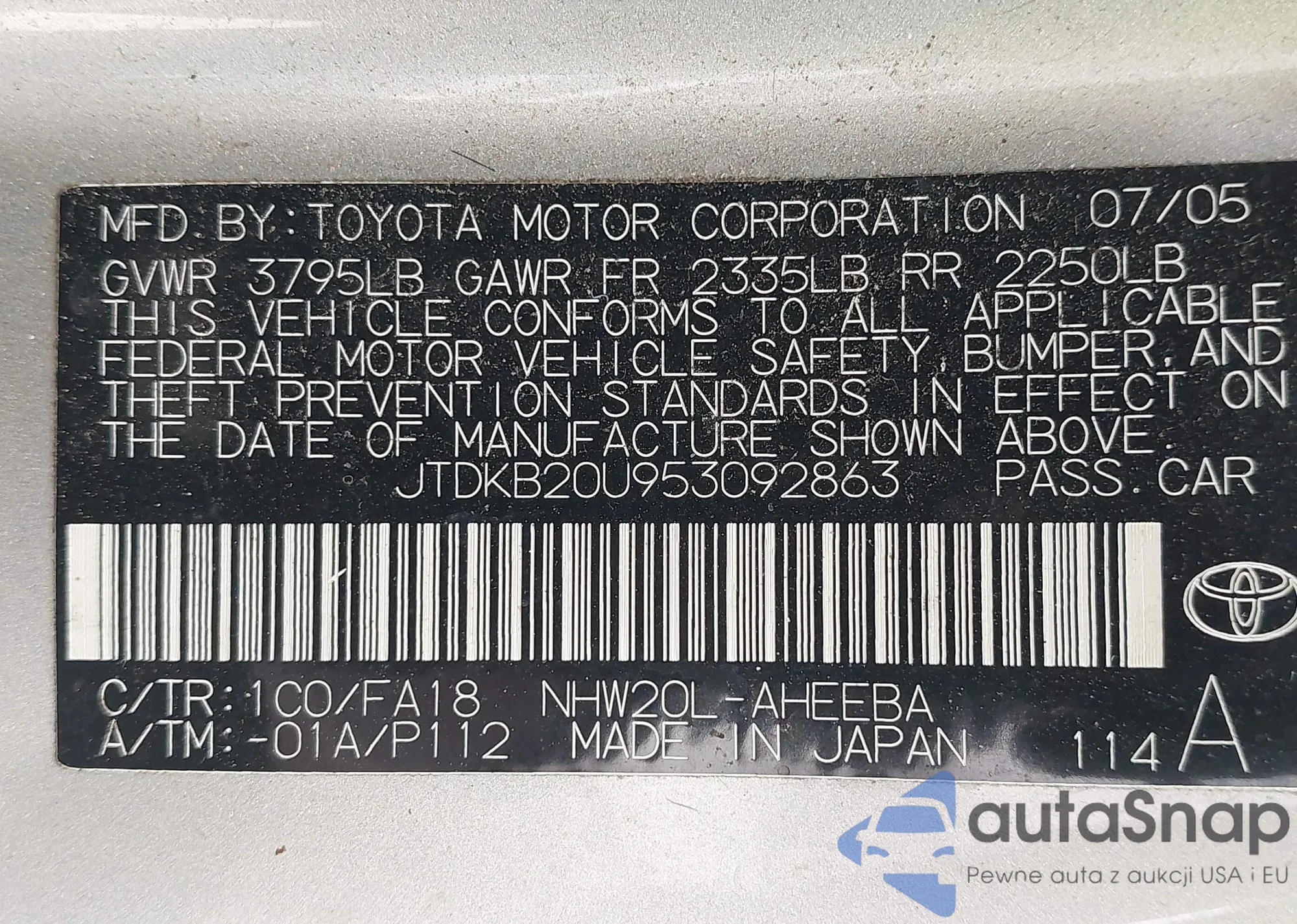 LOT: 42345757 VIN: JTDKB20U953092863