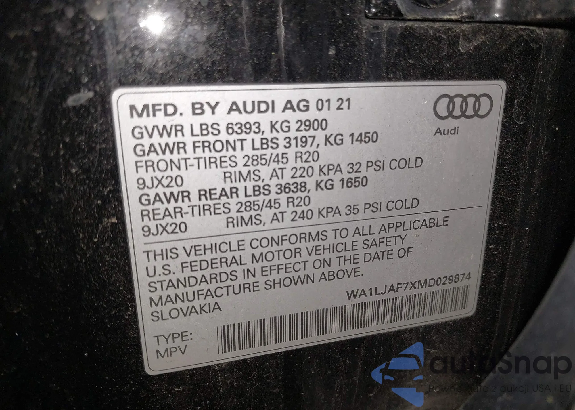 LOT: 42127941 VIN: WA1LJAF7XMD029874