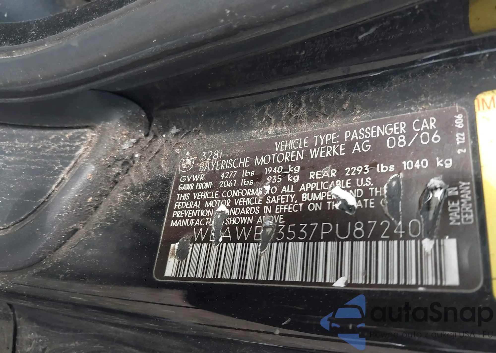 2007 BMW 328I from USA, damaged, VIN WBAWB33537PU87240
