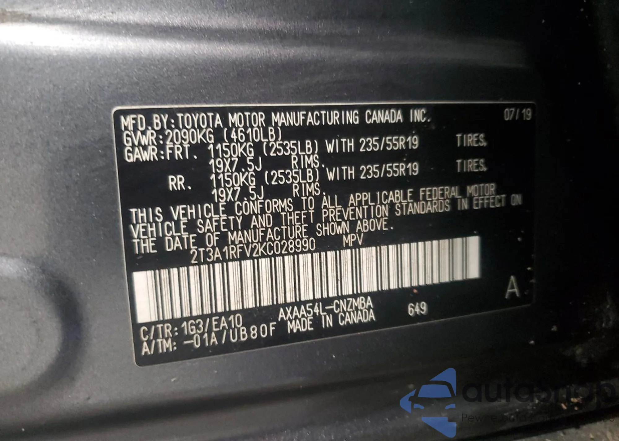 LOT: 63557255 VIN: 2T3A1RFV2KC028990