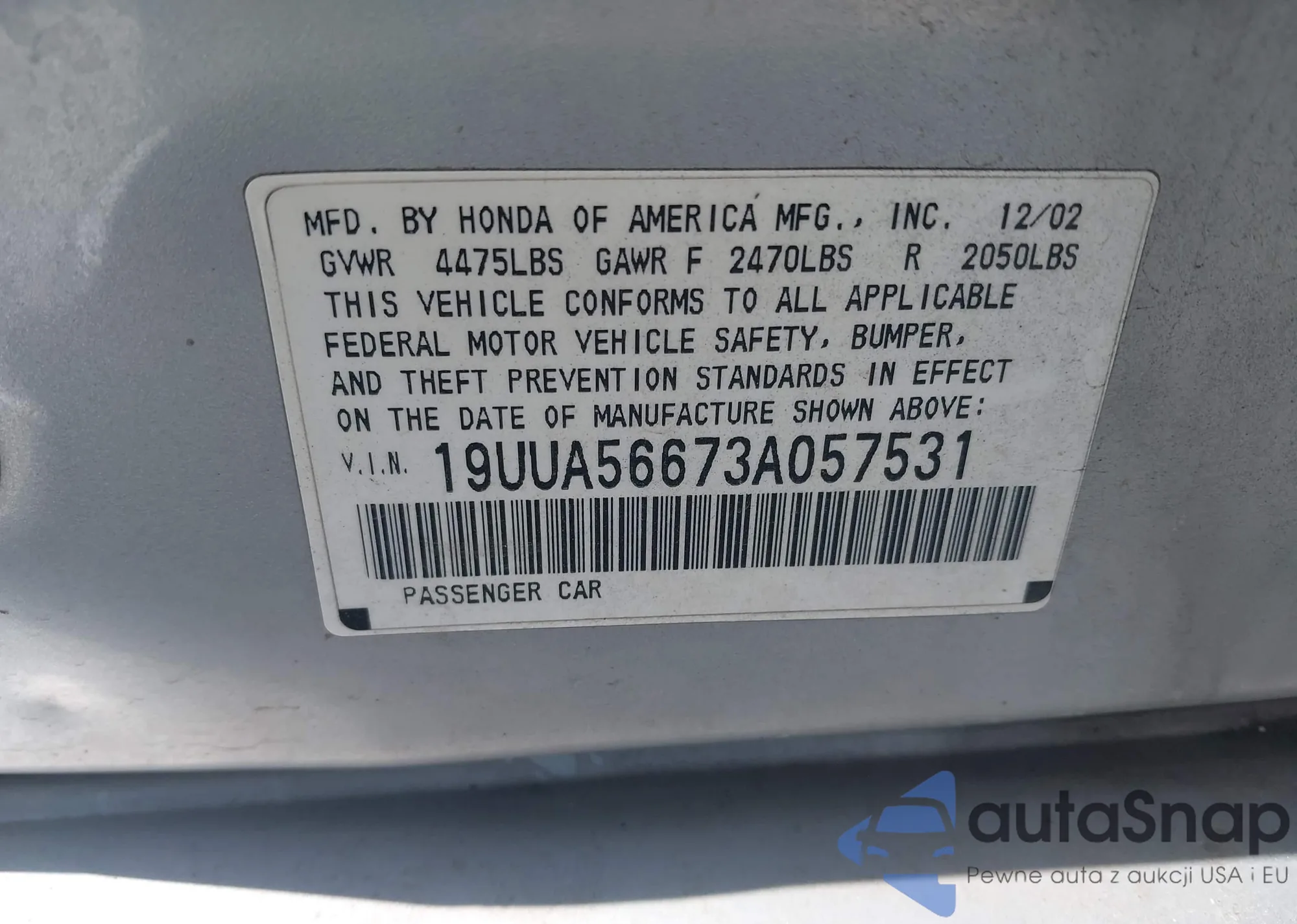 • VIN 19UUA56673A057531