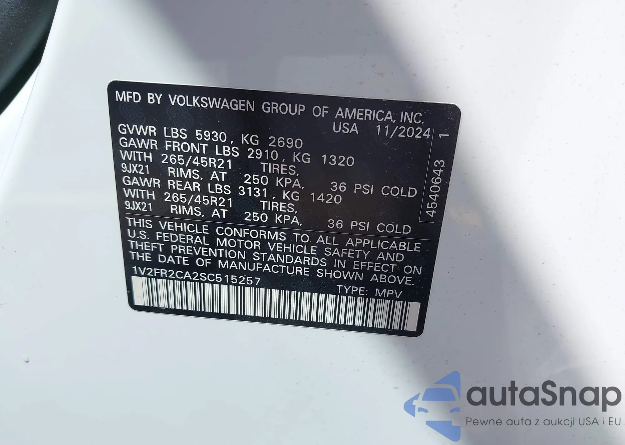 LOT: 42826498 VIN: 1V2FR2CA2SC515257