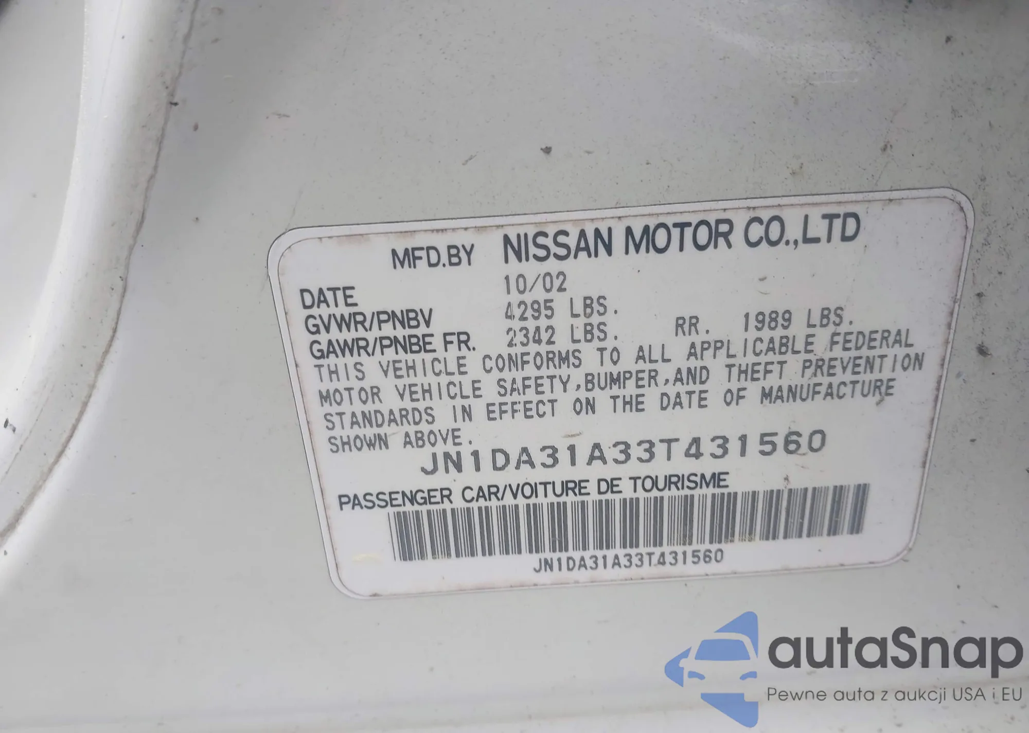 LOT: 42189300 VIN: JN1DA31A33T431560