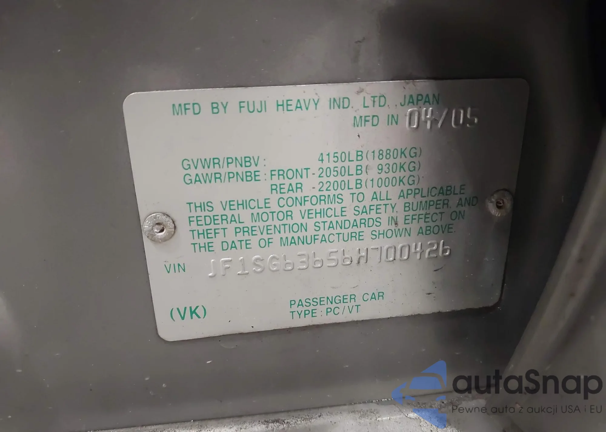 LOT: 42467619 VIN: JF1SG63656H700426