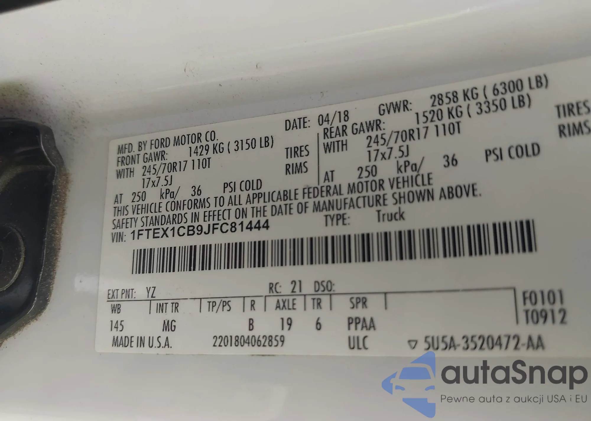 LOT: 42781145 VIN: 1FA6P8TH1F5307085