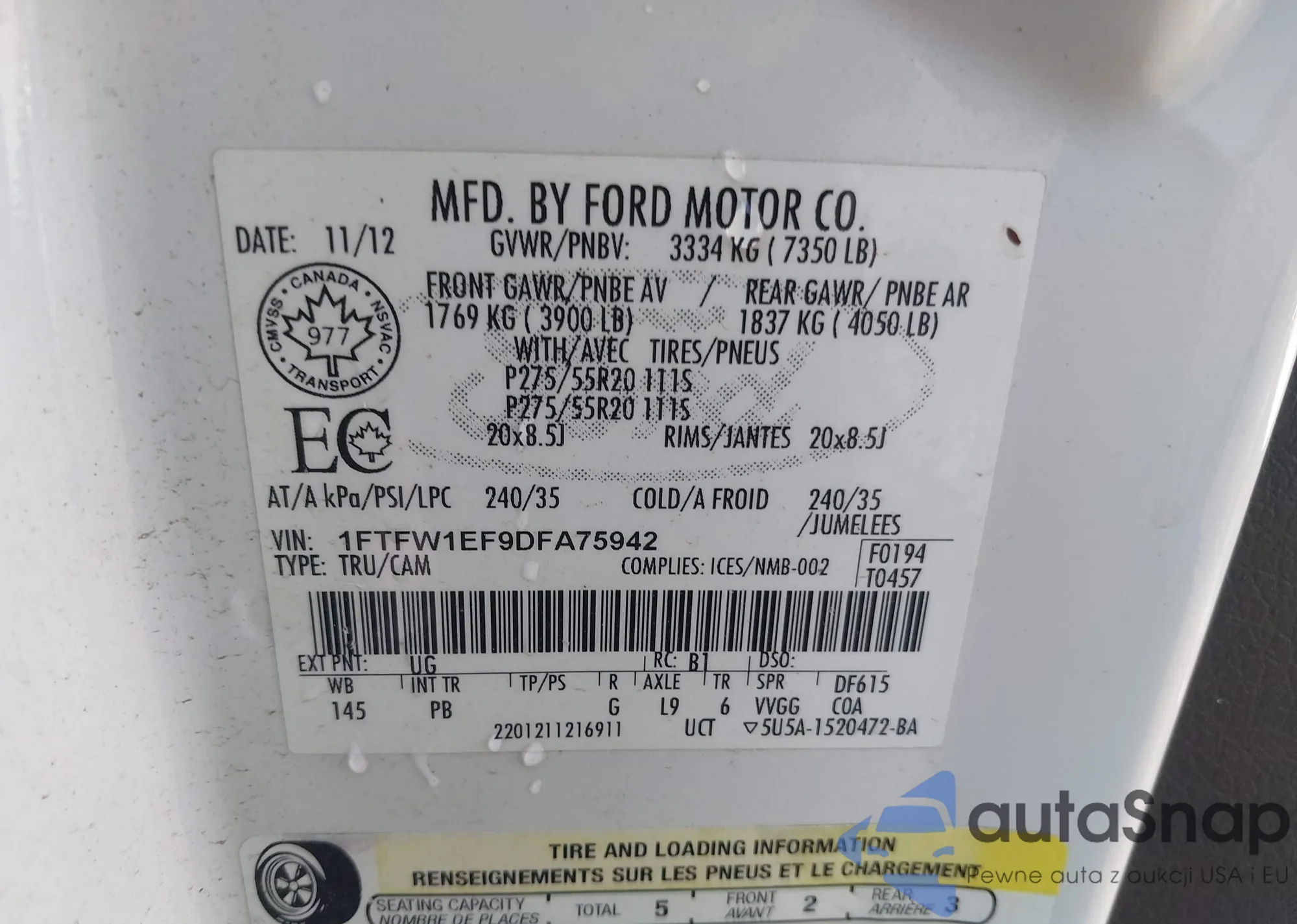 • VIN 1FTFW1EF9DFA75942