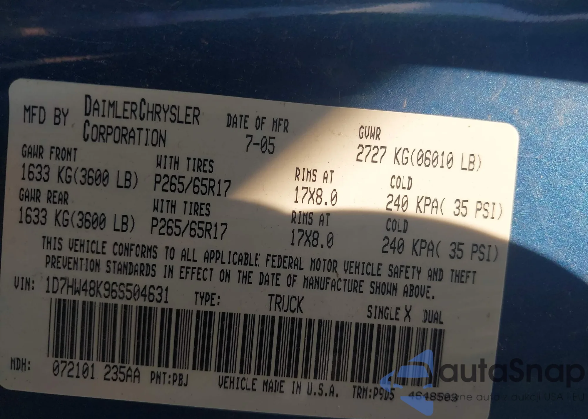 • VIN 1D7HW48K96S504631