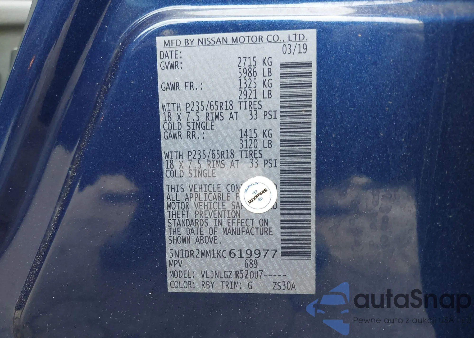 LOT: 42353996 VIN: 5N1DR2MM1KC619977