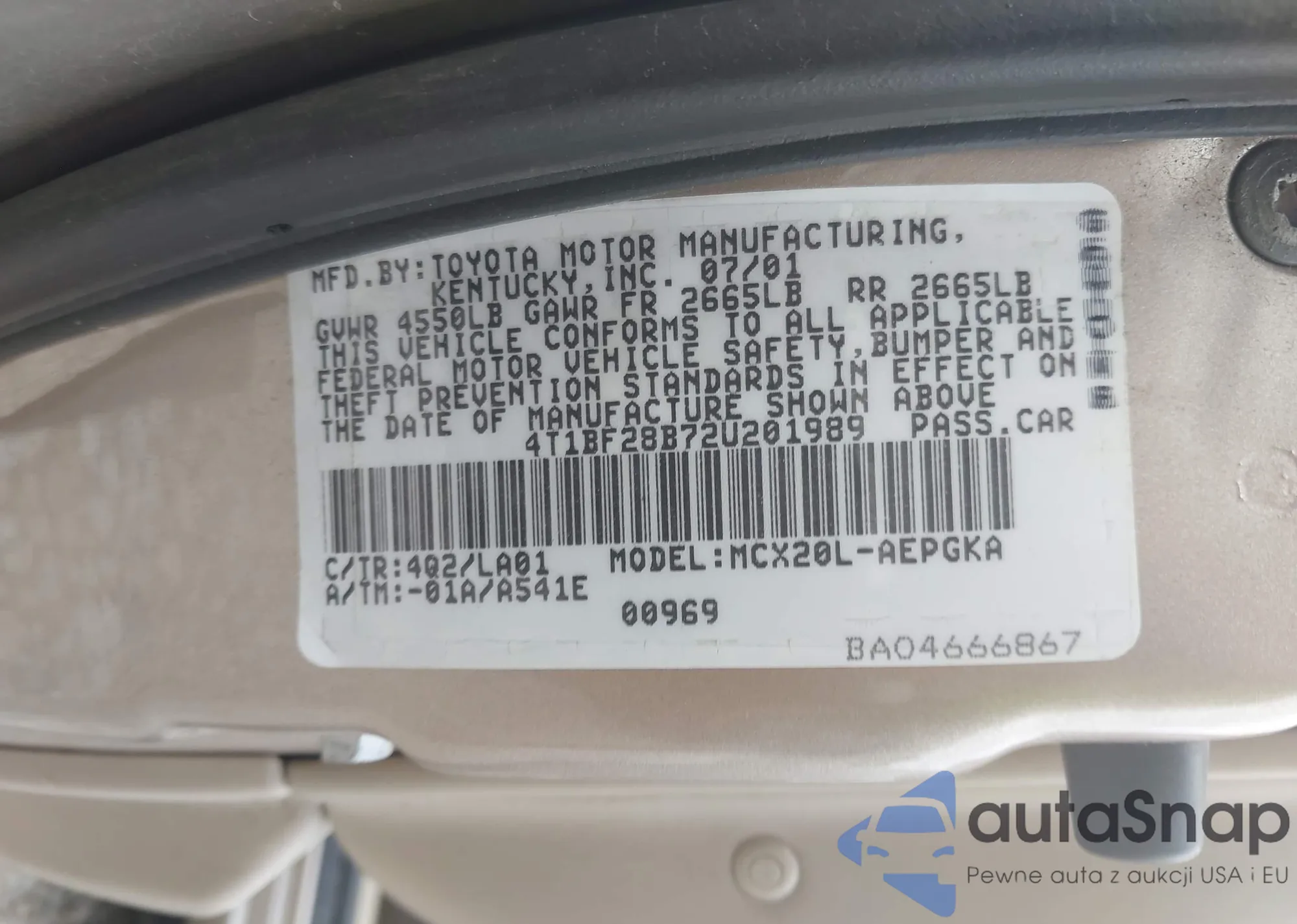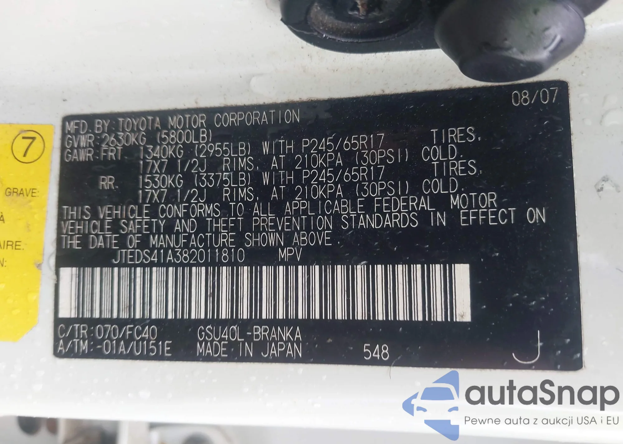 LOT: 42364248 VIN: JTEDS41A382011810