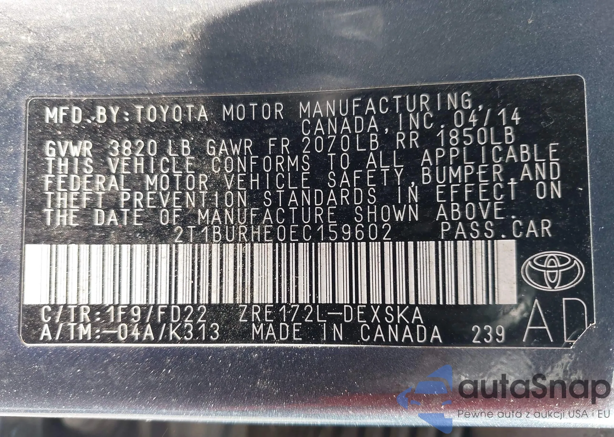 LOT: 42862329 VIN: 2T1BURHE0EC159602
