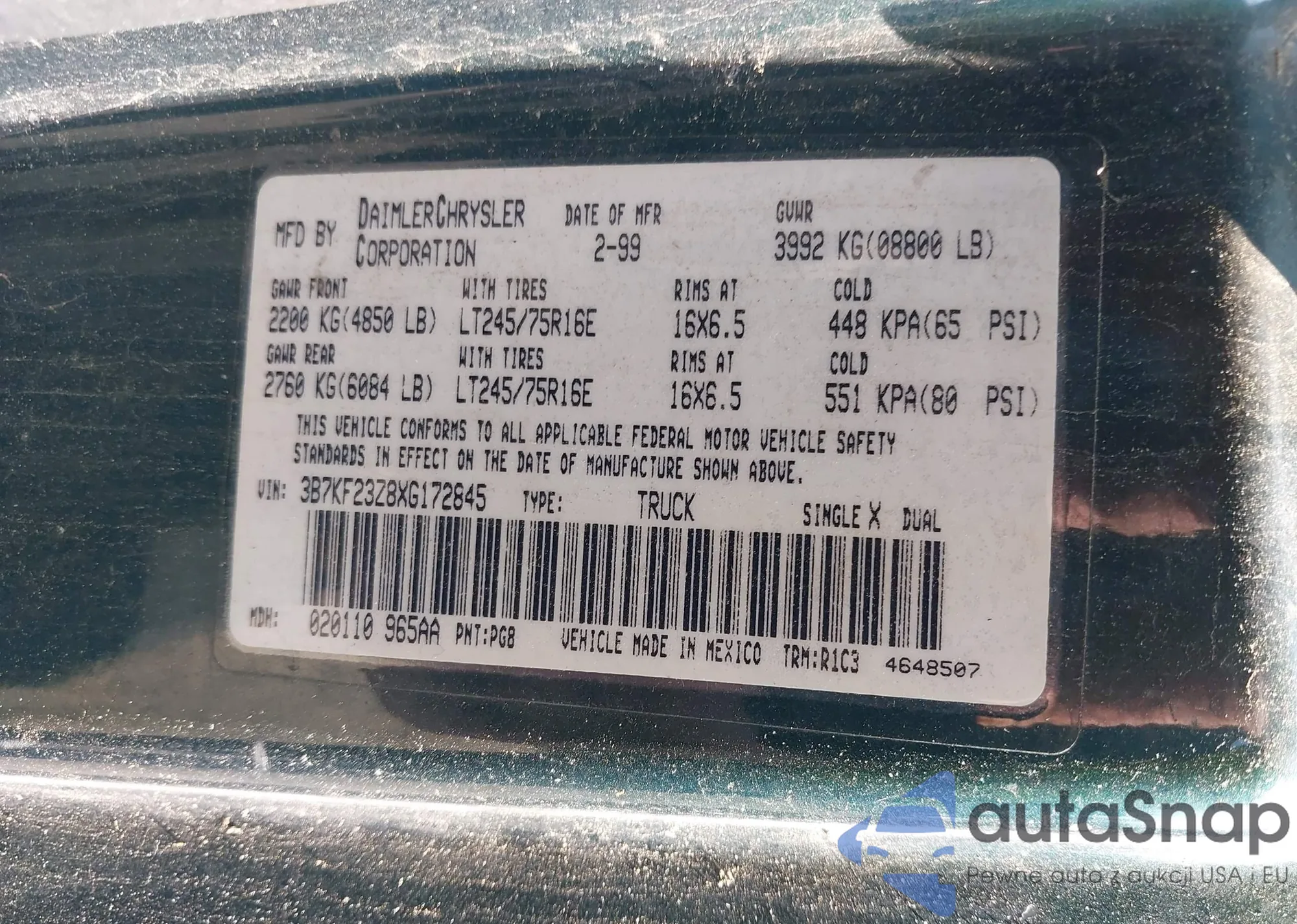 • VIN 3B7KF23Z8XG172845