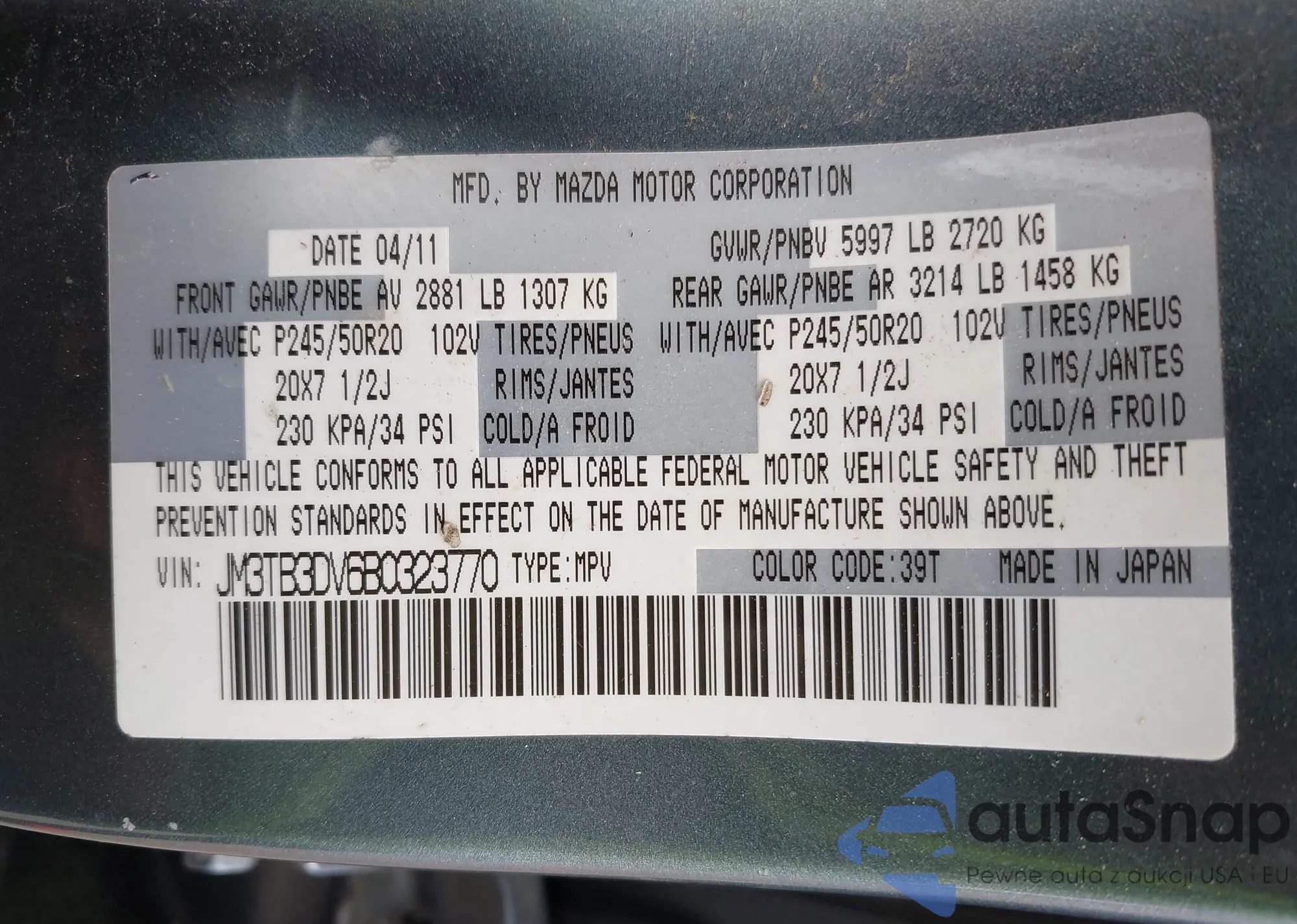 • VIN JM3TB3DV6B0323770