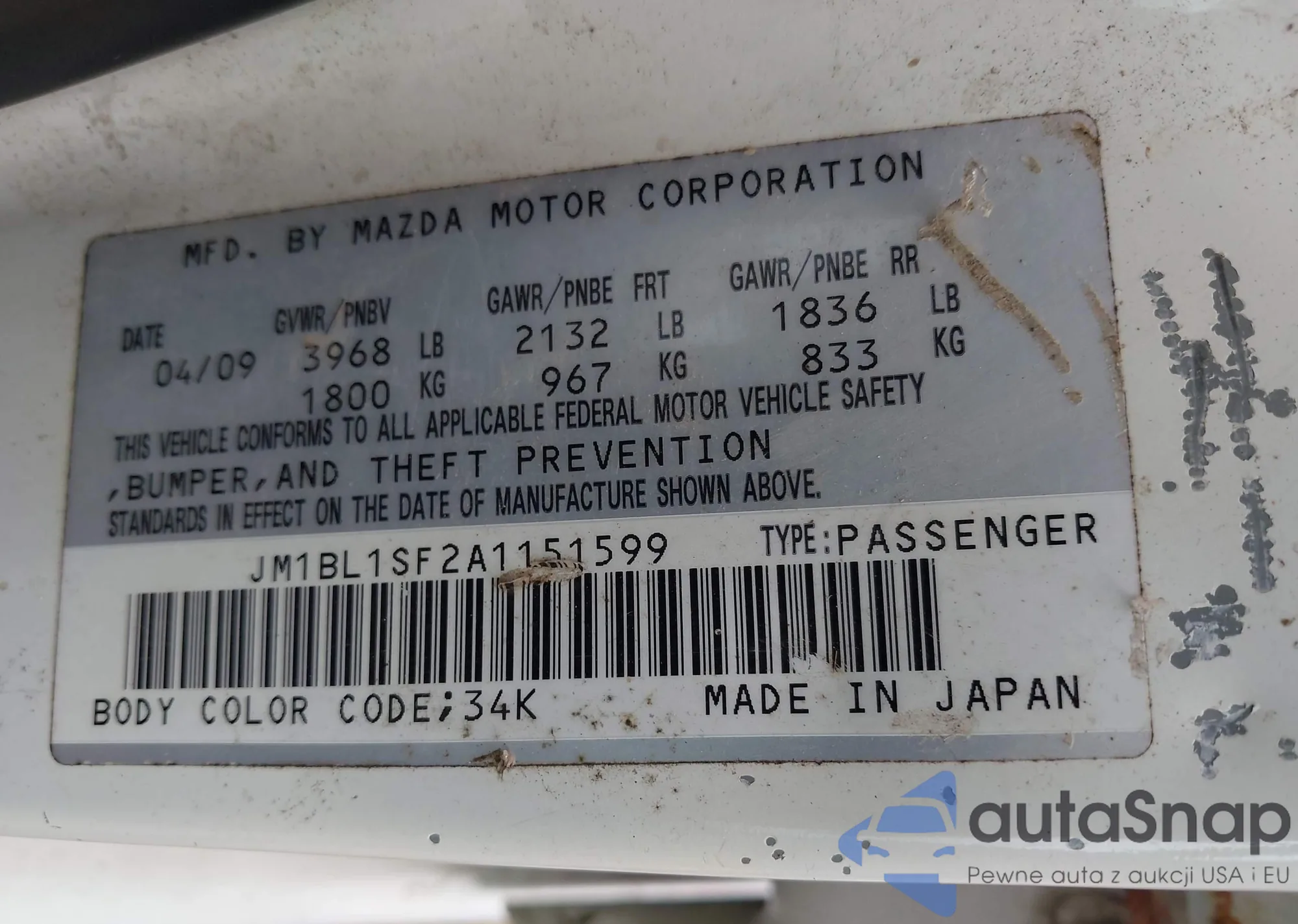 LOT: 42767037 VIN: JM1BL1SF2A1151599