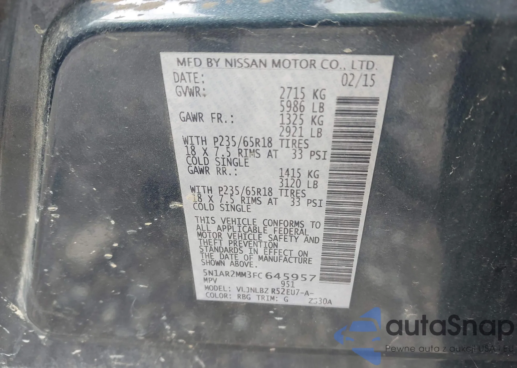 LOT: 42635344 VIN: 5N1AR2MM3FC645957
