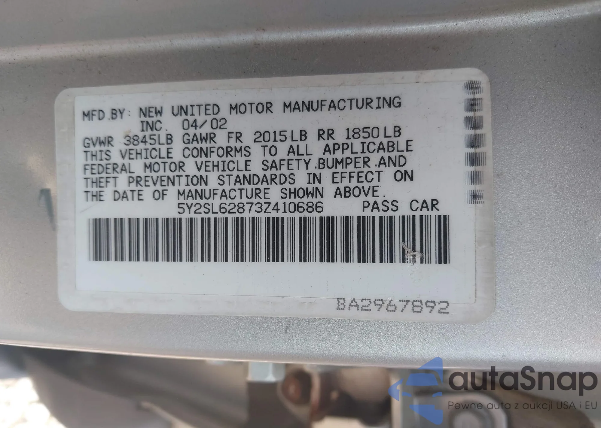 • VIN 5Y2SL62873Z410686