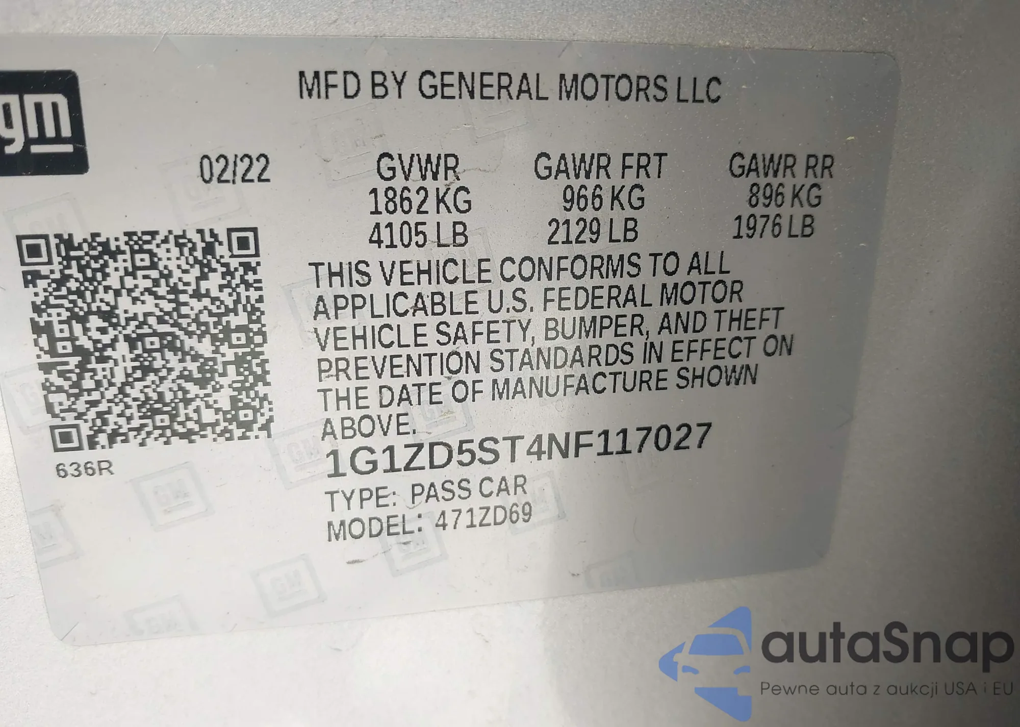 LOT: 42086552 VIN: 1G1ZD5ST4NF117027