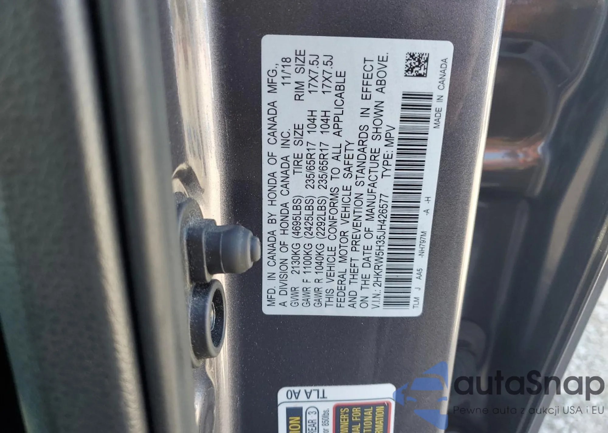 • VIN 2HKRW5H35JH426577