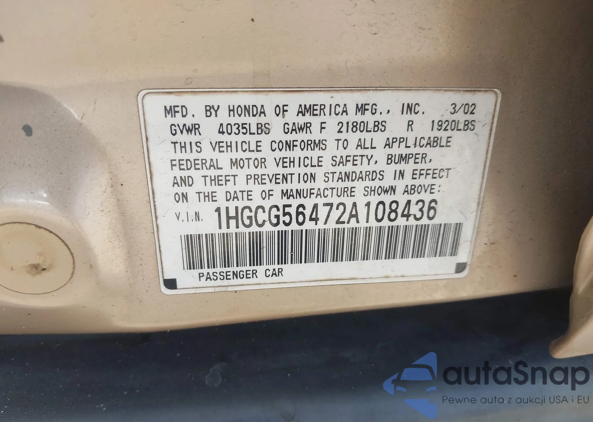 LOT: 42739122 VIN: 1HGCG56472A1085L4
