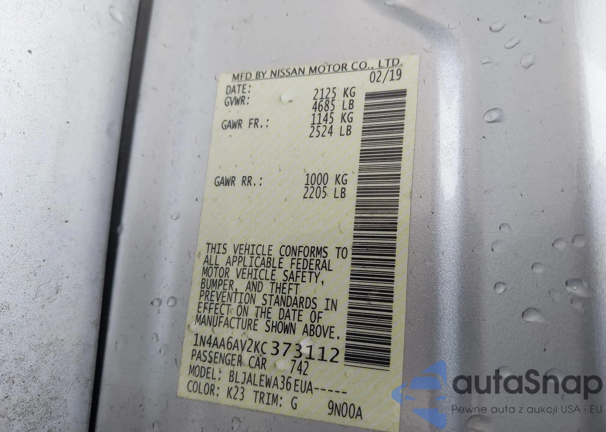 LOT: 42106965 VIN: 1N4AA6AV2KC373112