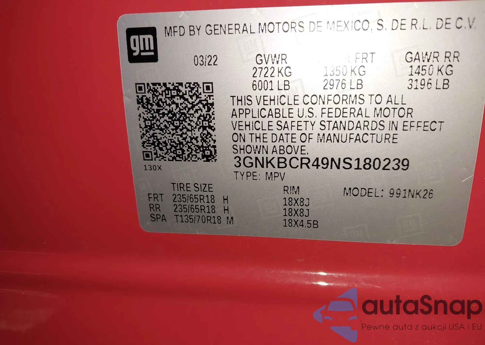 LOT: 41227306 VIN: 3GNKBCR49NS180239