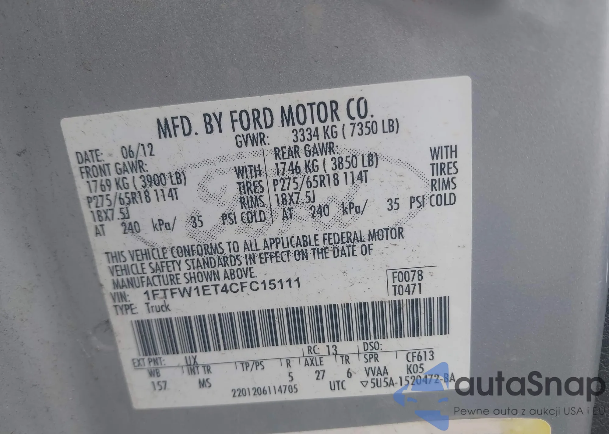 • VIN 1FTFW1ET4CFC15111