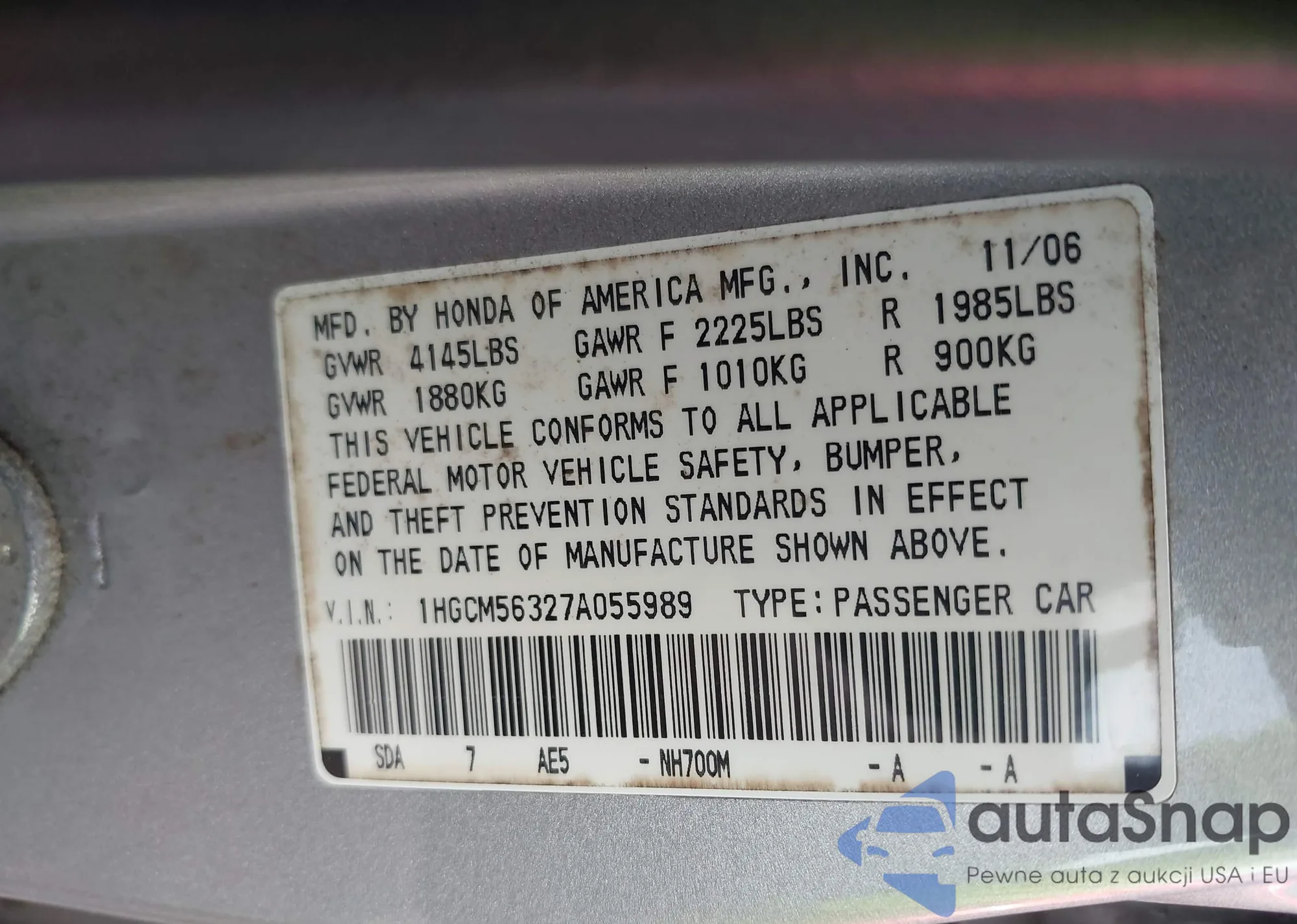 LOT: 42739870 VIN: 1HGCM56327A055989