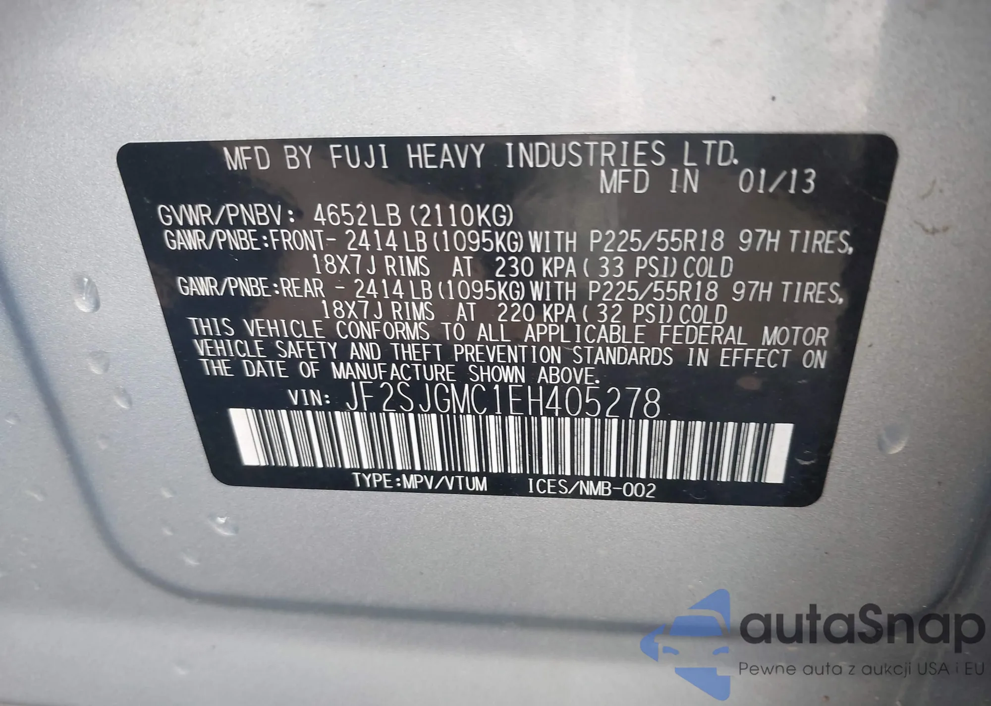 LOT: 42680411 VIN: JF2SJGMC1EH405278