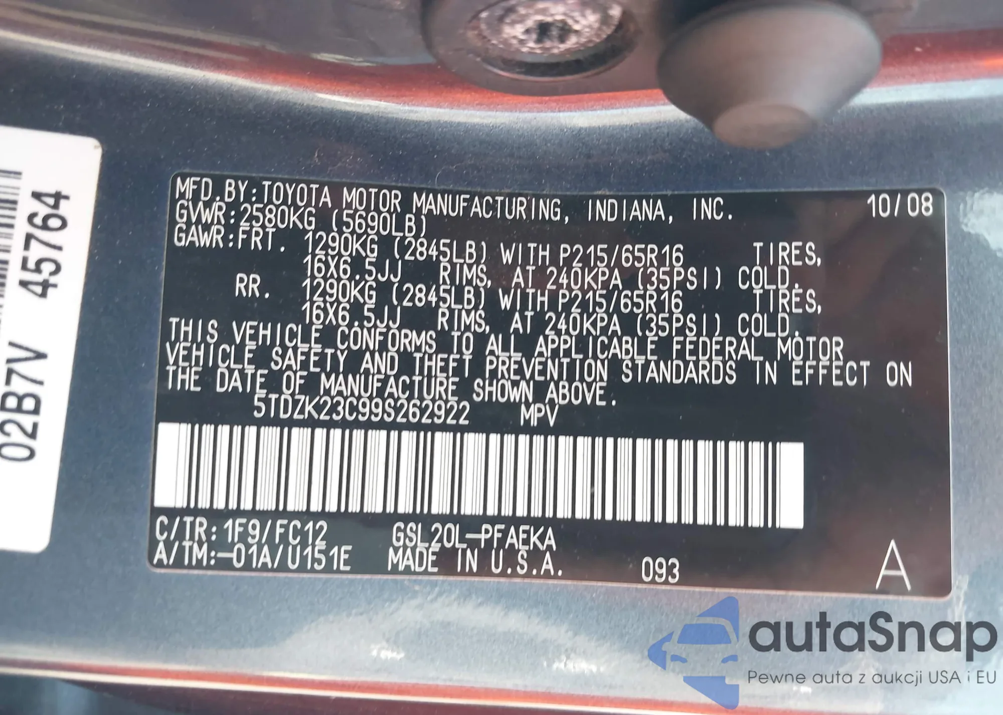 LOT: 42752088 VIN: 5TDZK23C99S262922