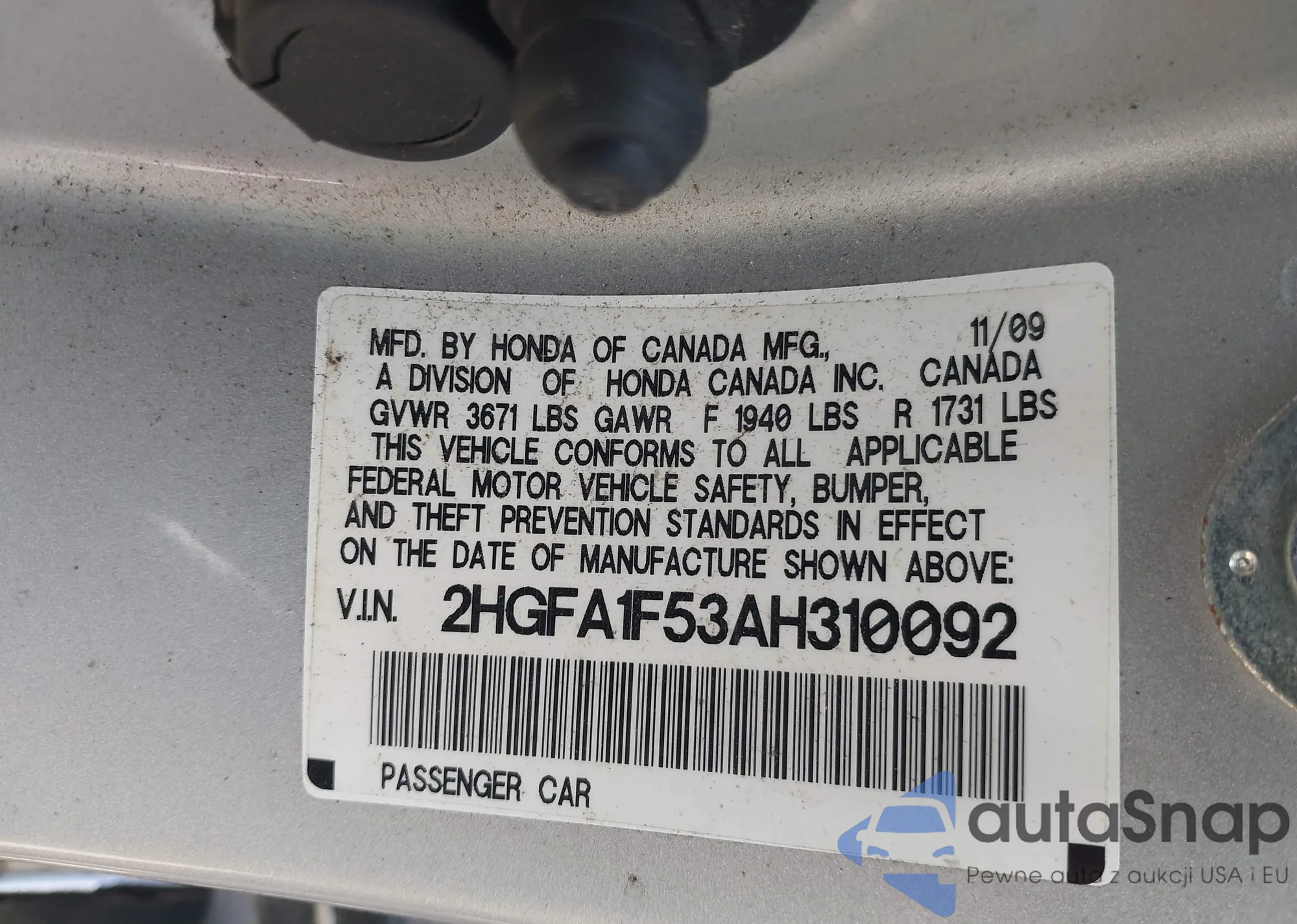 • VIN 2HGFA1F53AH310092