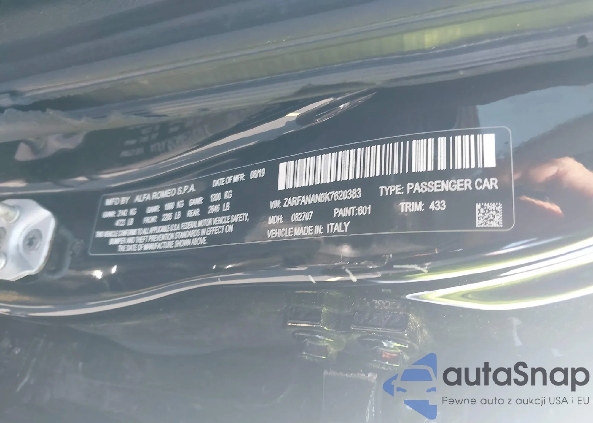 LOT: 42659600 VIN: ZARFANAN8K7620383