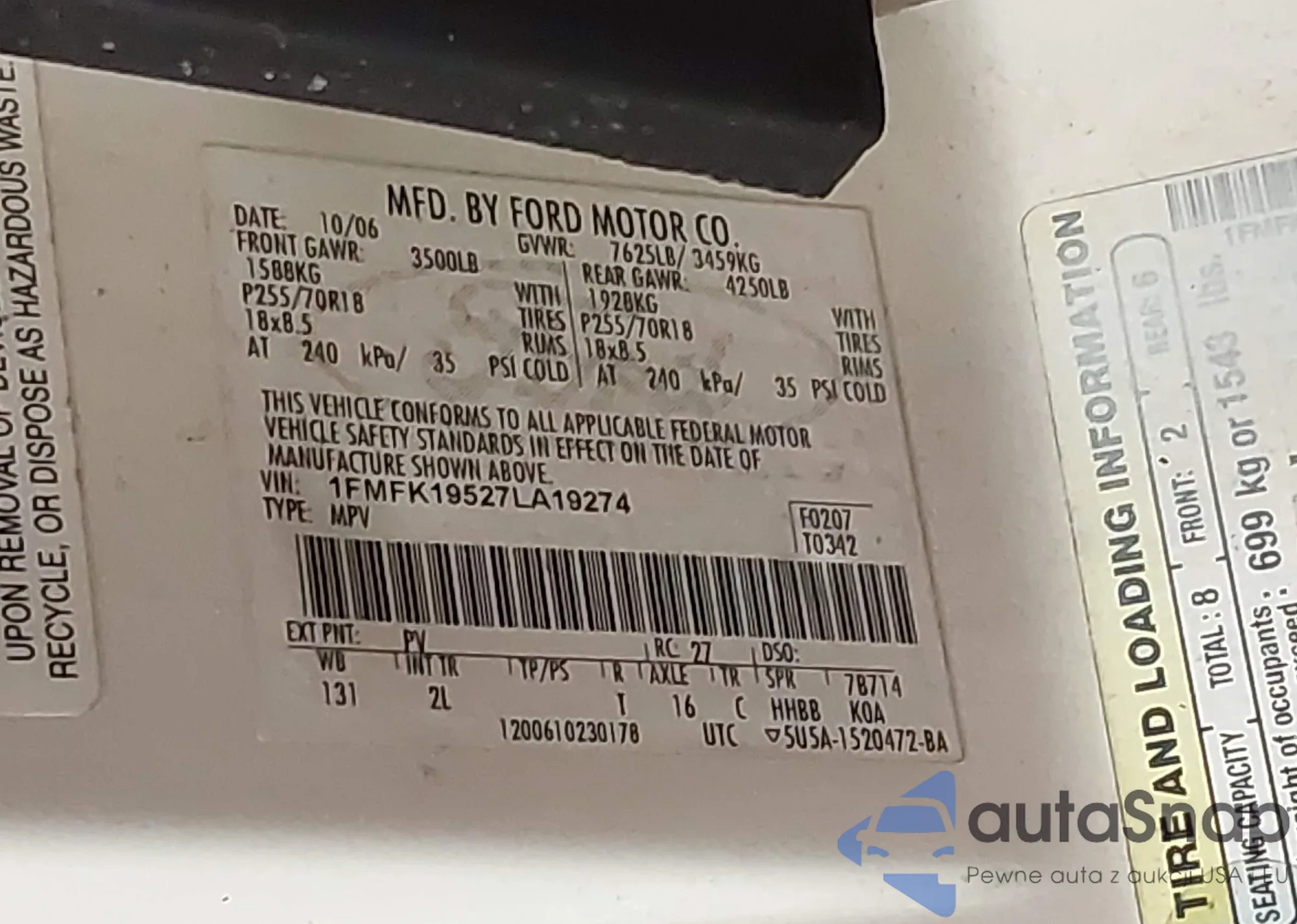 LOT: 42275302 VIN: 1FMFK19527LA19274