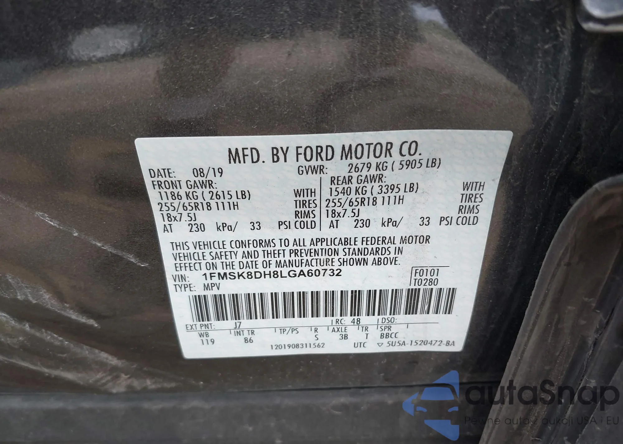 LOT: 42436262 VIN: 1FMSK8DH8LGA60732