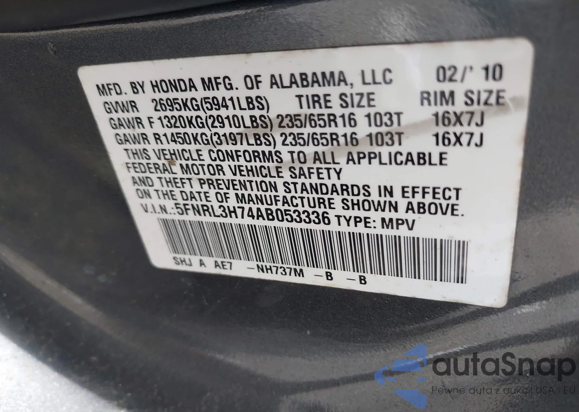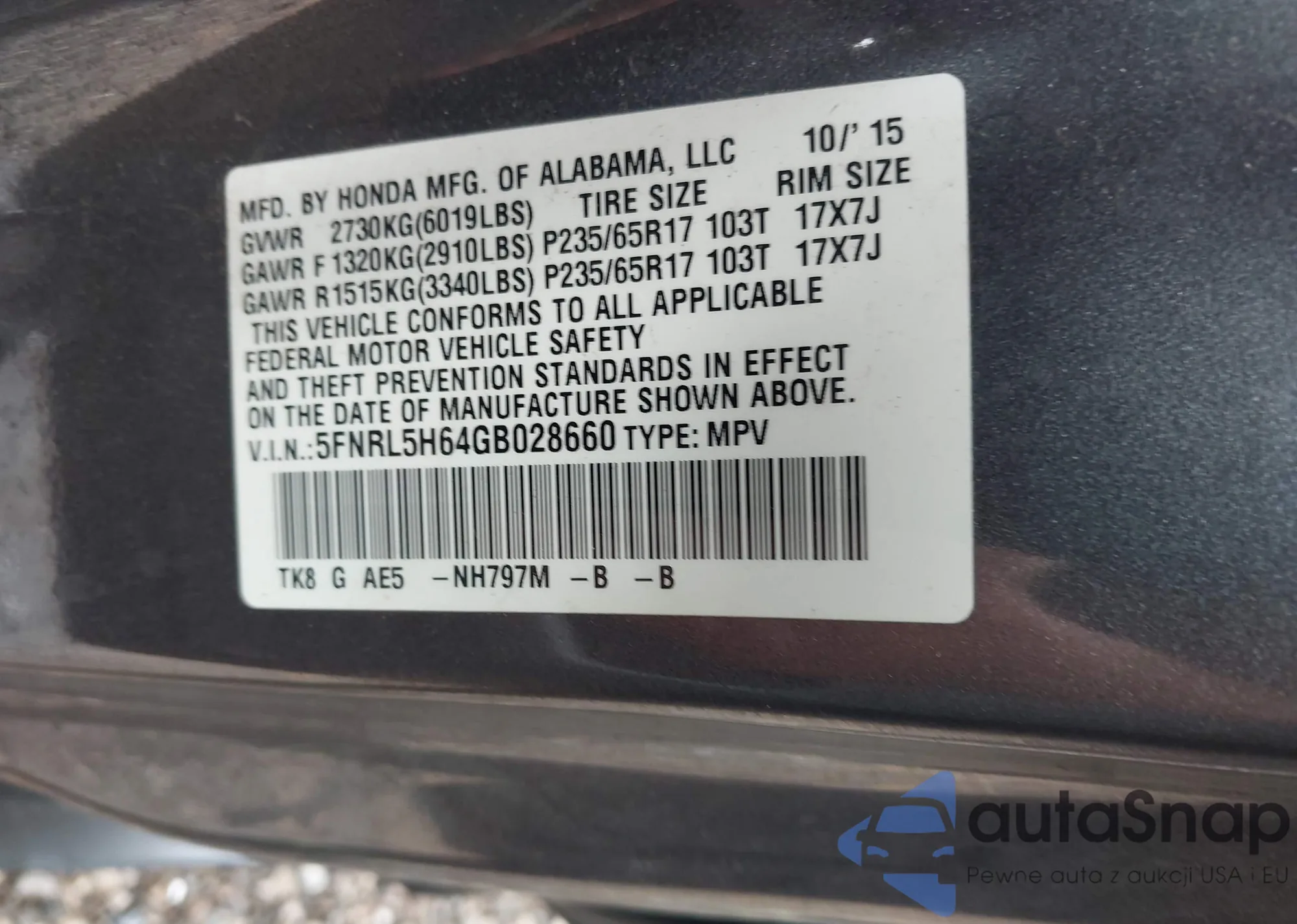 • VIN 5FNRL5H64GB028660