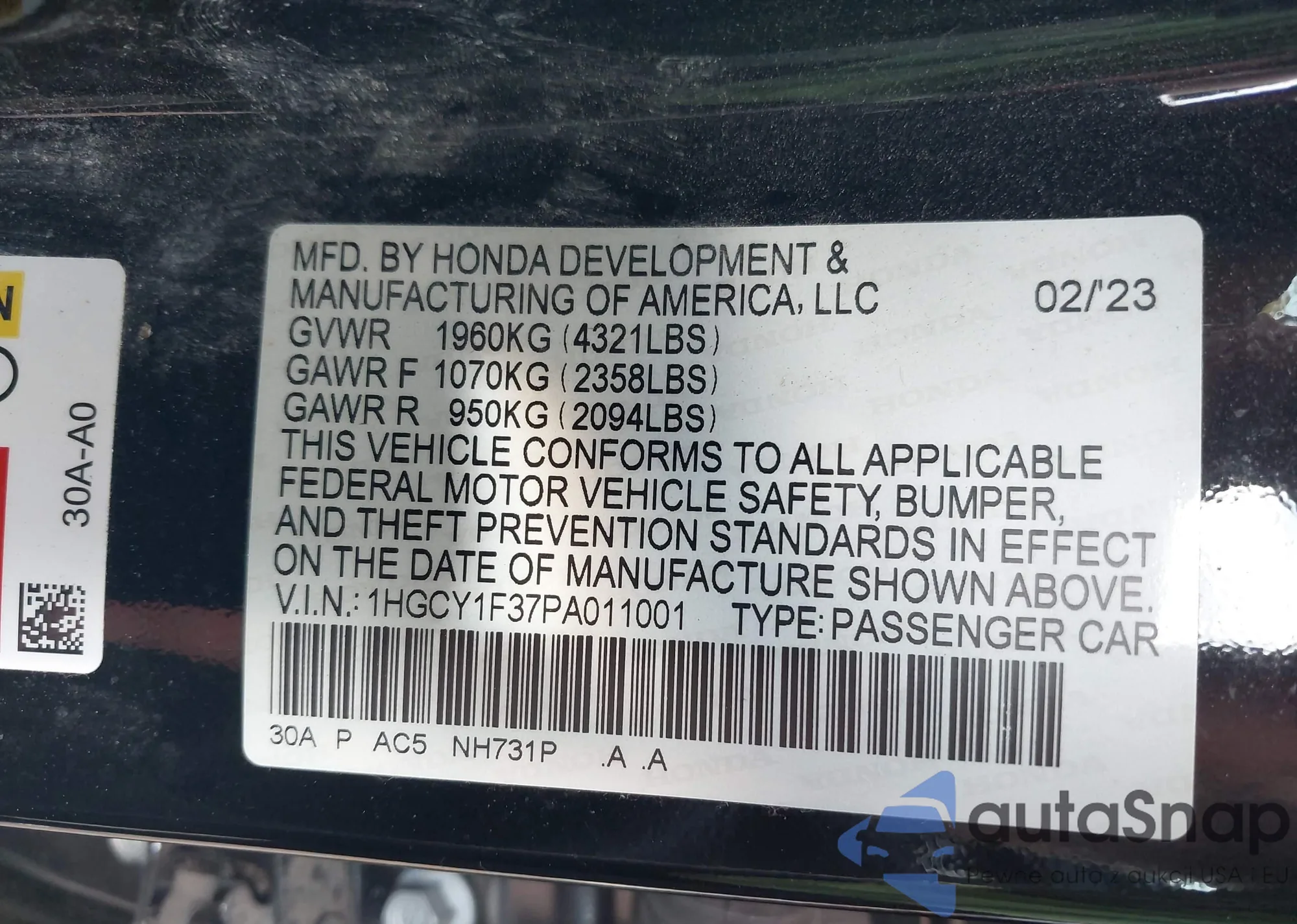 • VIN 1HGCY1F37PA011001
