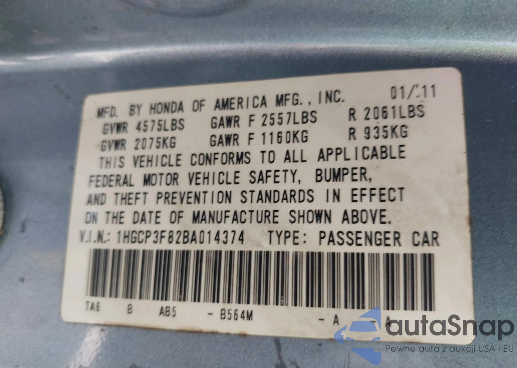 LOT: 42714947 VIN: 1HGCP3F82BA014374