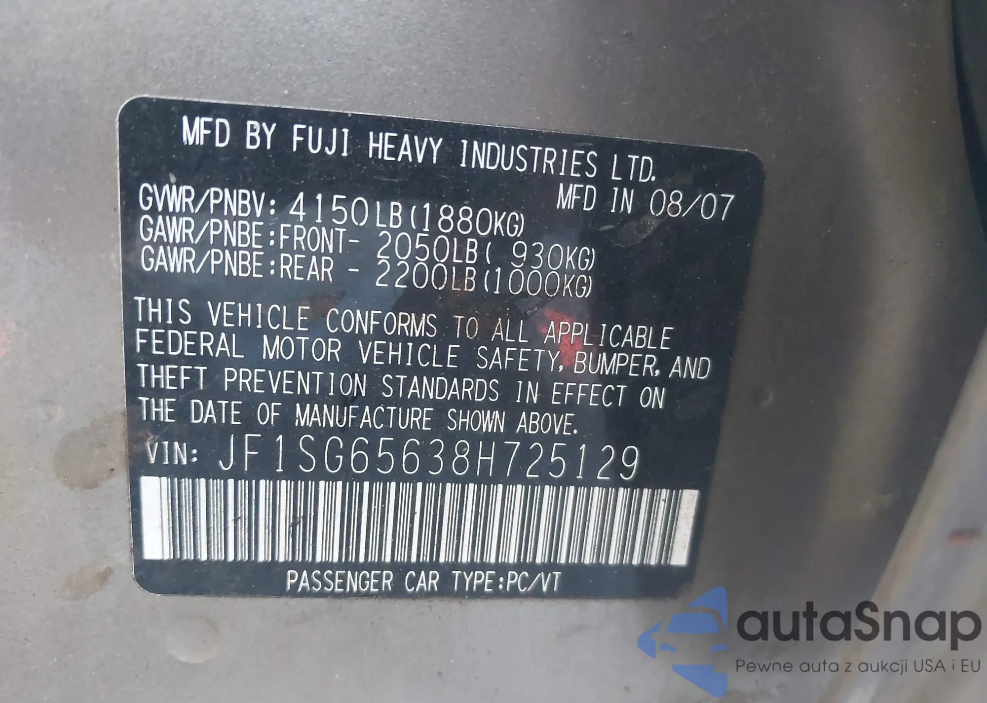 LOT: 42690852 VIN: JF1SG65638H725129