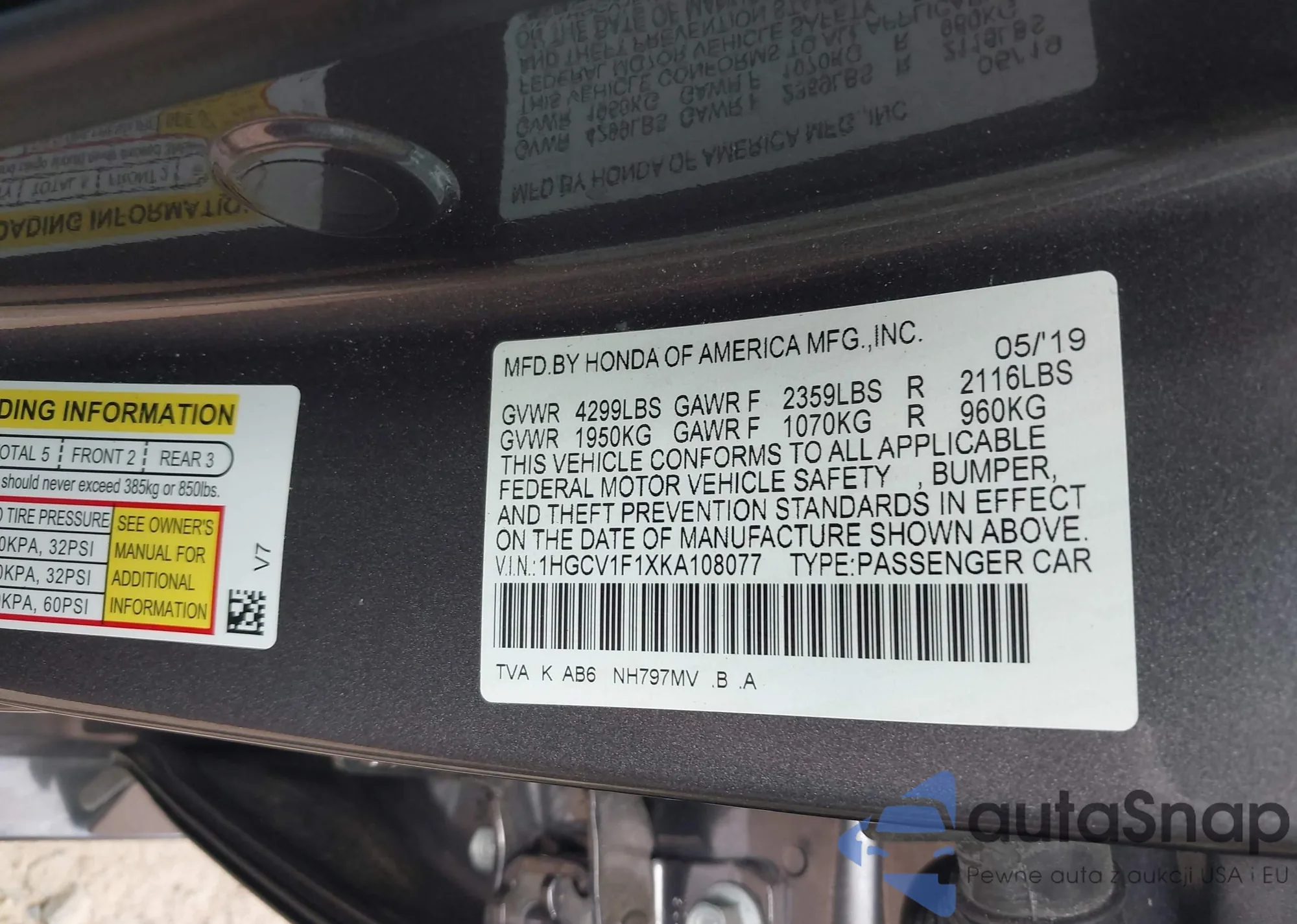 LOT: 42727831 VIN: 1HGCV1F1XKA108077