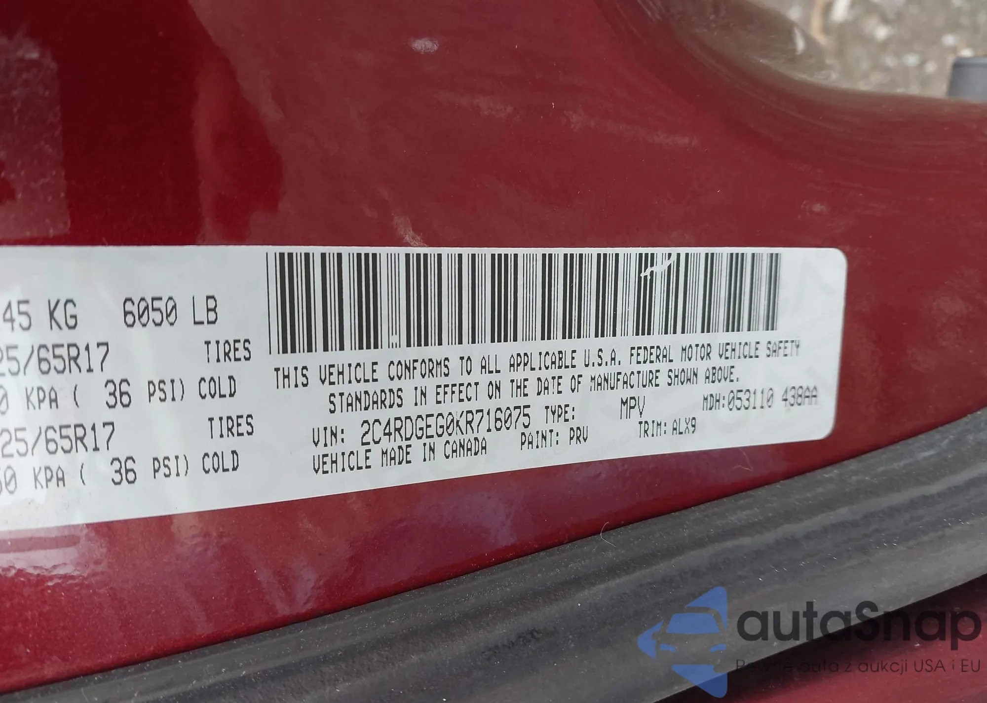 • VIN 2C4RDGEG0KR716075